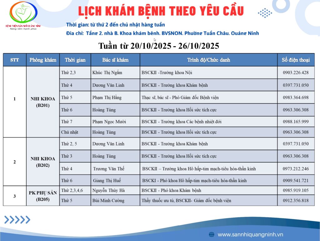 LỊCH KHÁM BỆNH THEO YÊU CẦU TẠI BỆNH VIỆN SẢN NHI QUẢNG NINH TỪ NGÀY 20/10/2025 – 26/10/2025 —————– Đăng ký khám trực tuyến bằng 1 trong 3 cách sau: Gọi điện đến TỔNG ĐÀI chăm sóc khách hàng: 0912.048.799 để được hỗ trợ đặt lịch. Đăng ký trực tuyến tại WEBSITE https://www.sannhiquangninh.vn/ vào mục […]