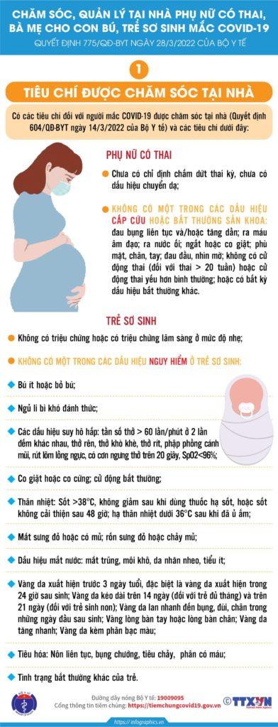Ngày 28/3/2022 Bộ Y tế ban hành Quyết định 775/QĐ-BYT Hướng dẫn chăm sóc, quản lý tại nhà đối với phụ nữ có thai, bà mẹ cho con bú và trẻ sơ sinh mắc COVID-19. Dưới đây là nội dung hướng dẫn được trình bày trực quan lại dưới mô hình hóa cụ thể: