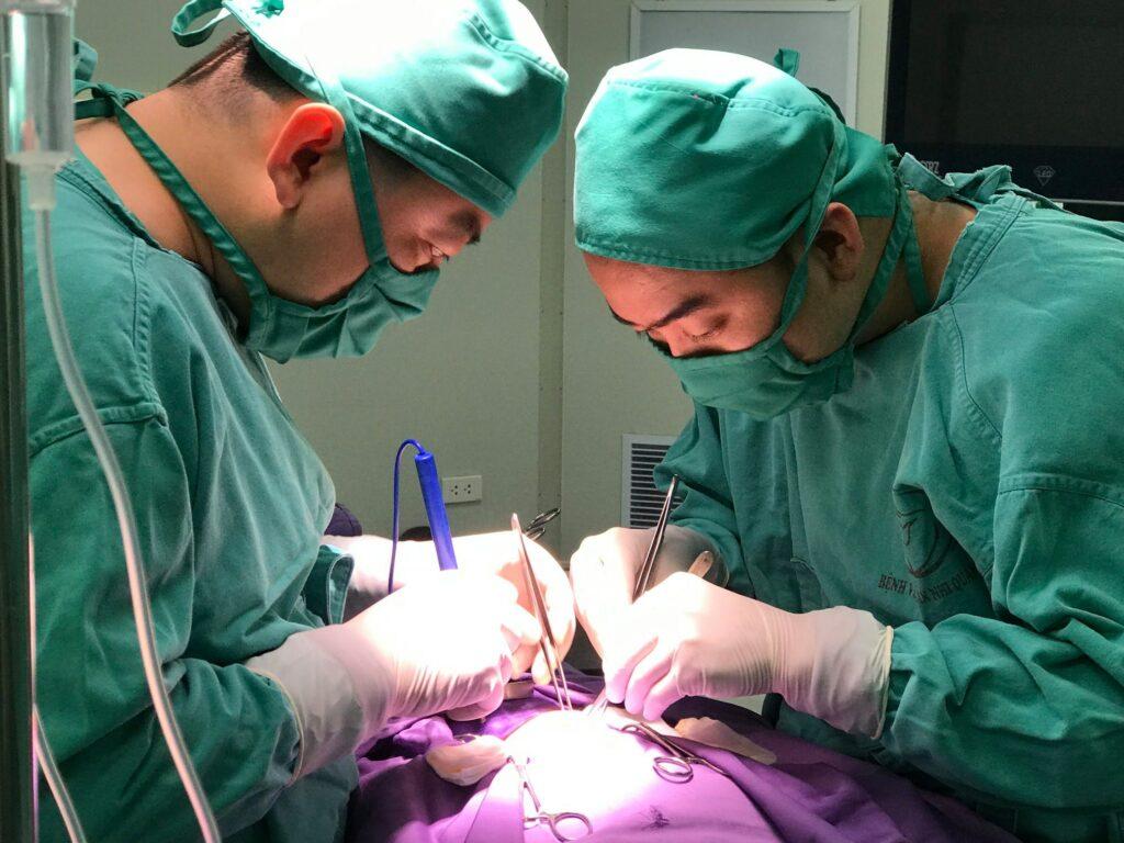 Xác định đây là một trường hợp khó: trẻ sinh non rất yếu, cân nặng cực thấp (thời điểm thoát vị bẹn nghẹt cháu 900g) kết hợp nhiều bệnh lý. Do đó đến ngày 28/7 sau quá trình điều trị hồi sức tích cực cùng với hội chẩn toàn viện đưa ra phác đồ điều trị thích hợp, các bác sĩ khoa Ngoại chuyên khoa đã tiến hành phẫu thuật cho trẻ kết hợp hồi sức tích cực sau mổ, đã thành công giải phóng khối thoát vị, giải phóng tối đa tinh hoàn; phẫu tích bảo tồn bó mạch thừng tinh, ống dẫn tinh tạo đường xuống bìu, hạ tinh hoàn xuống bìu.