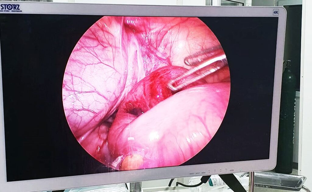 Qua khai thác và thăm khám lâm sàng, các bác sĩ chẩn đoán trẻ bị thoát vị bẹn nghẹt bên phải. Ngay lập tức kíp cấp cứu khẩn trương chuyển bé lên phòng mổ nội soi cấp cứu, kịp thời đưa khối thoát vị là một đoạn ruột non dài 08cm ra khỏi ống bẹn, sau 5 phút đoạn ruột đã được cung cấp máu và hồng trở lại, tránh được tình trạng dẫn đến hoại tử ruột. Sau mổ, sức khỏe trẻ dần ổn định và đã được ra viện.