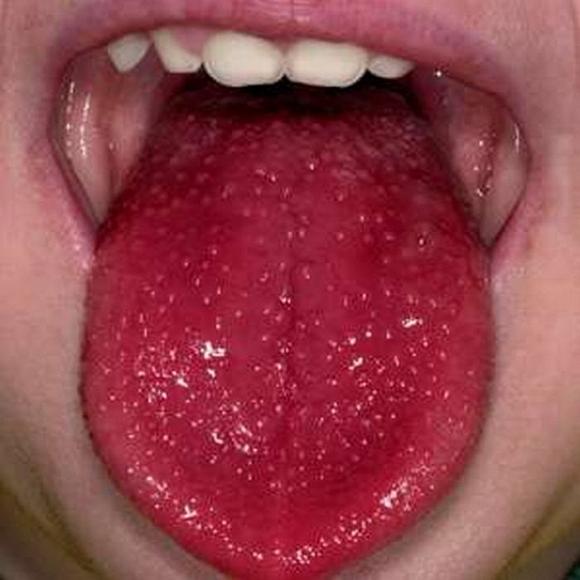 - Thay đổi khoang miệng: Môi đỏ sẫm , mọng hoặc rỉ máu; Phù đỏ khoang miệng; Lưỡi đỏ nổi gai, “ lưỡi dâu tây” ( Strawberry tongue).