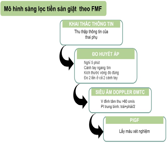 - Tất cả thai phụ nên được sàng lọc tiền sản giật từ 11 tuần 3 ngày – 13 tuần 6 ngày theo mô hình của FMF (yếu tố nguy cơ từ thai phụ, MAP, UTPI, PlGF) để xác định nguy cơ xuất hiện tiền sản giật từ đó có liệu trình điều trị dự phòng tiền sản giật cho thai phụ