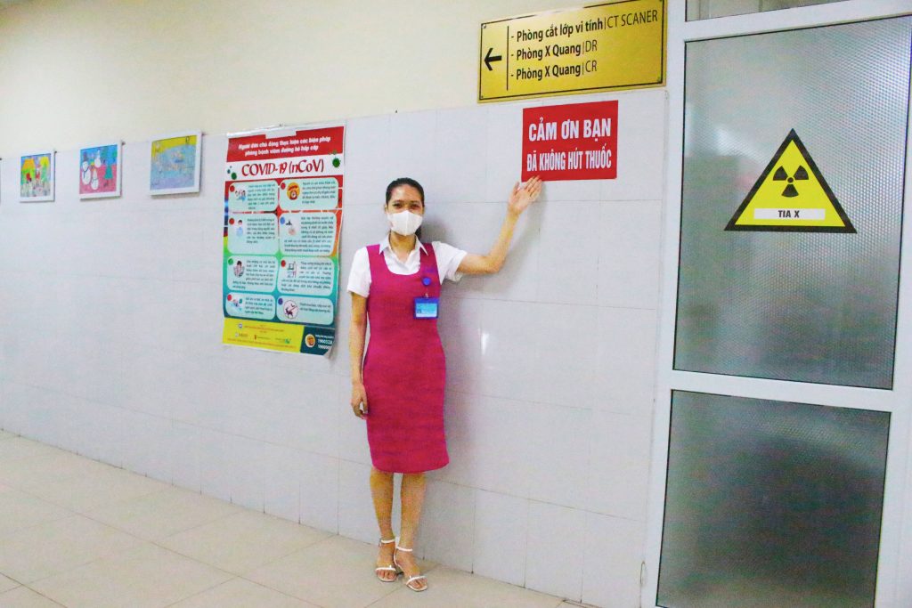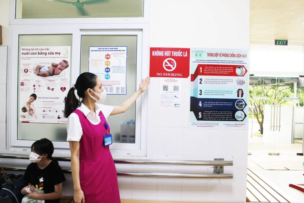 Cùng với đó, còn bố trí lắp đặt các biển báo cấm hút thuốc ở các hành lang, khu tiếp đón, phòng khám và các buồng bệnh; dán các áp phích, pa-nô tuyên truyền về tác hại của thuốc lá tại khu vực đông người qua lại. Đội ngũ nhân viên y tế tích cực tuyên truyền cho người bệnh và người nhà bệnh nhân về tác hại của thuốc lá đến sức khỏe, nhằm nâng cao ý thức phòng, chống tác hại thuốc lá, bảo vệ sức khỏe cộng đồng. Tổ bảo vệ, tổ giám sát và các nhân viên trong Bệnh viện tích cực giám sát, thường xuyên nhắc nhở người bệnh và người nhà nghiêm túc thực hiện các quy định cấm hút thuốc trong khuôn viên Bệnh viện