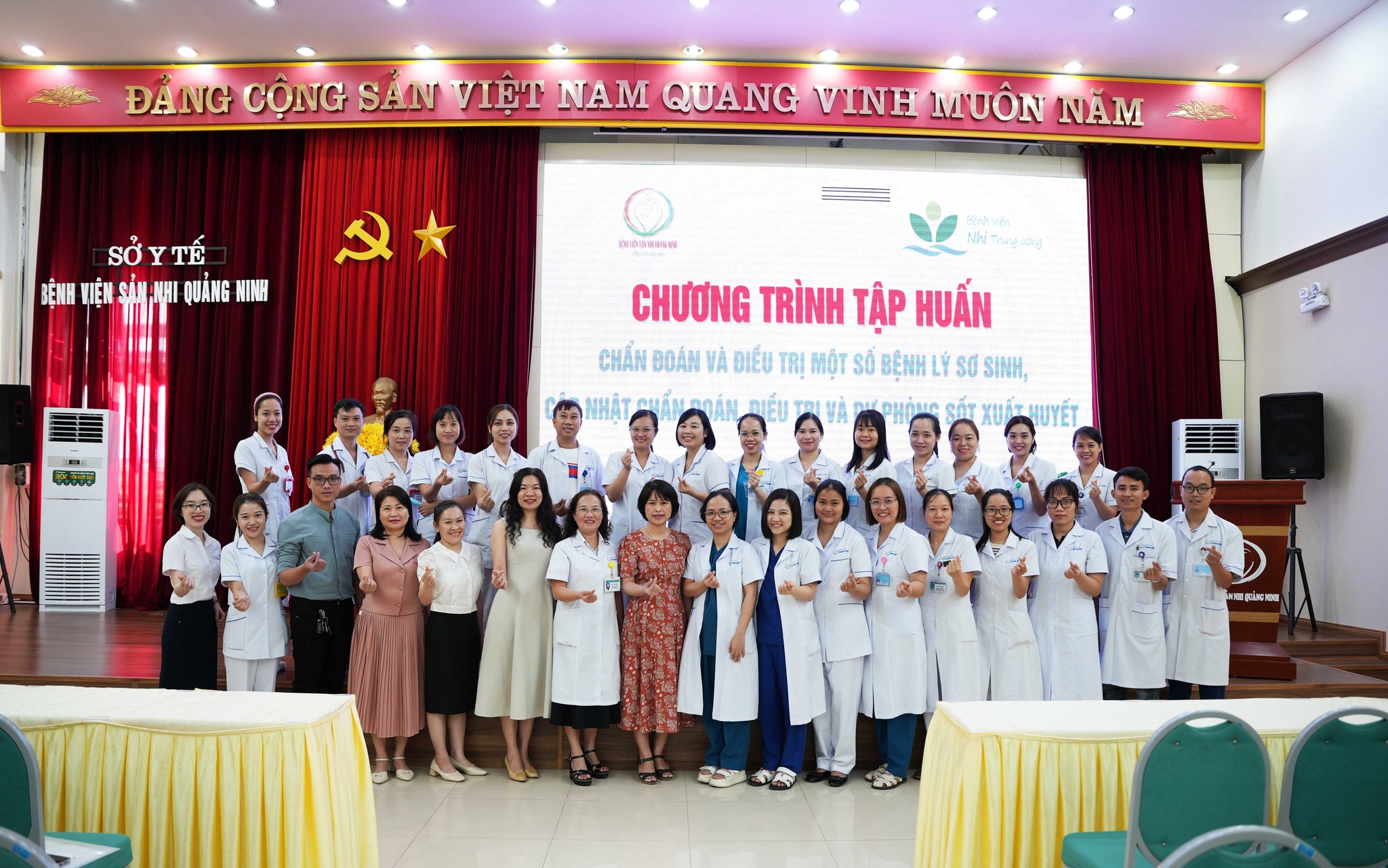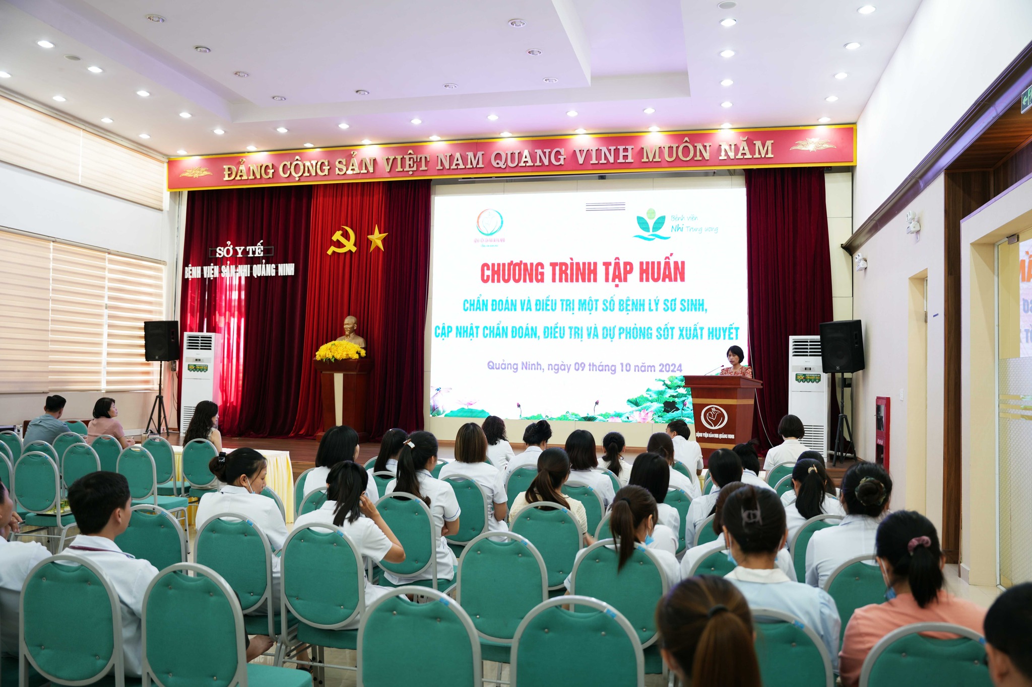 Ngày 09/10, Bệnh viện Sản Nhi Quảng Ninh phối hợp với Bệnh viện Nhi Trung ương tổ chức Chương trình tập huấn chuyên môn: “Chẩn đoán, điều trị một số bệnh lý sơ sinh và cập nhật chẩn đoán, điều trị và dự phòng sốt xuất huyết” cho các cán bộ, y bác sĩ, nhân viên y tế tại Bệnh viện. Tham dự và trực tiếp giảng dạy tại buổi tập huấn, về phía Bệnh viện Nhi Trung ương có: Ths.BS Phạm Thế Việt, khoa Điều trị tích cực, Trung tâm Bệnh nhiệt đới; BS CKII Trịnh Thị Thu Hà, khoa Điều trị tích cực Sơ sinh, Trung tâm Sơ sinh cùng các bác sĩ đang công tác tại Bệnh viện Nhi Trung ương