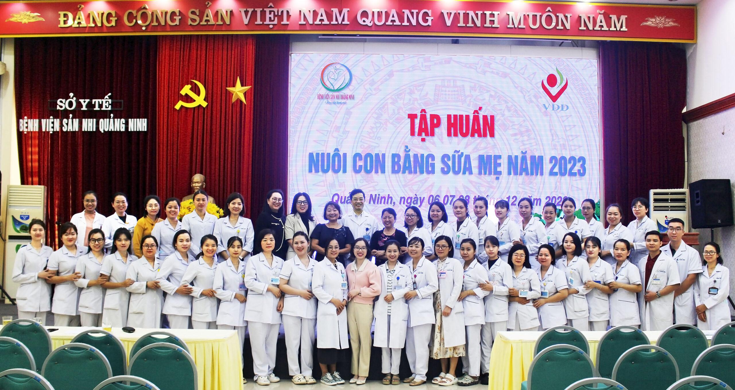 Nhằm củng cố và bổ sung các kiến thức, kỹ năng về tư vấn, thực hành cho các cán bộ y tế tại bệnh viện về Nuôi con bằng sữa mẹ; Trong các ngày từ 06-08/12/2023, Bệnh viện Sản Nhi Quảng Ninh phối hợp với Viện Dinh Dưỡng –Bộ Y (VDD) tế tổ chức các lớp tập huấn nâng cao kiến thức và kỹ năng về “Nuôi con bằng sữa mẹ” cho trên 40 học viên là các y bác sĩ, điều dưỡng, hộ sinh, kỹ thuật viên làm công tác chăm sóc sức khỏe bà mẹ và trẻ em tại bệnh viện