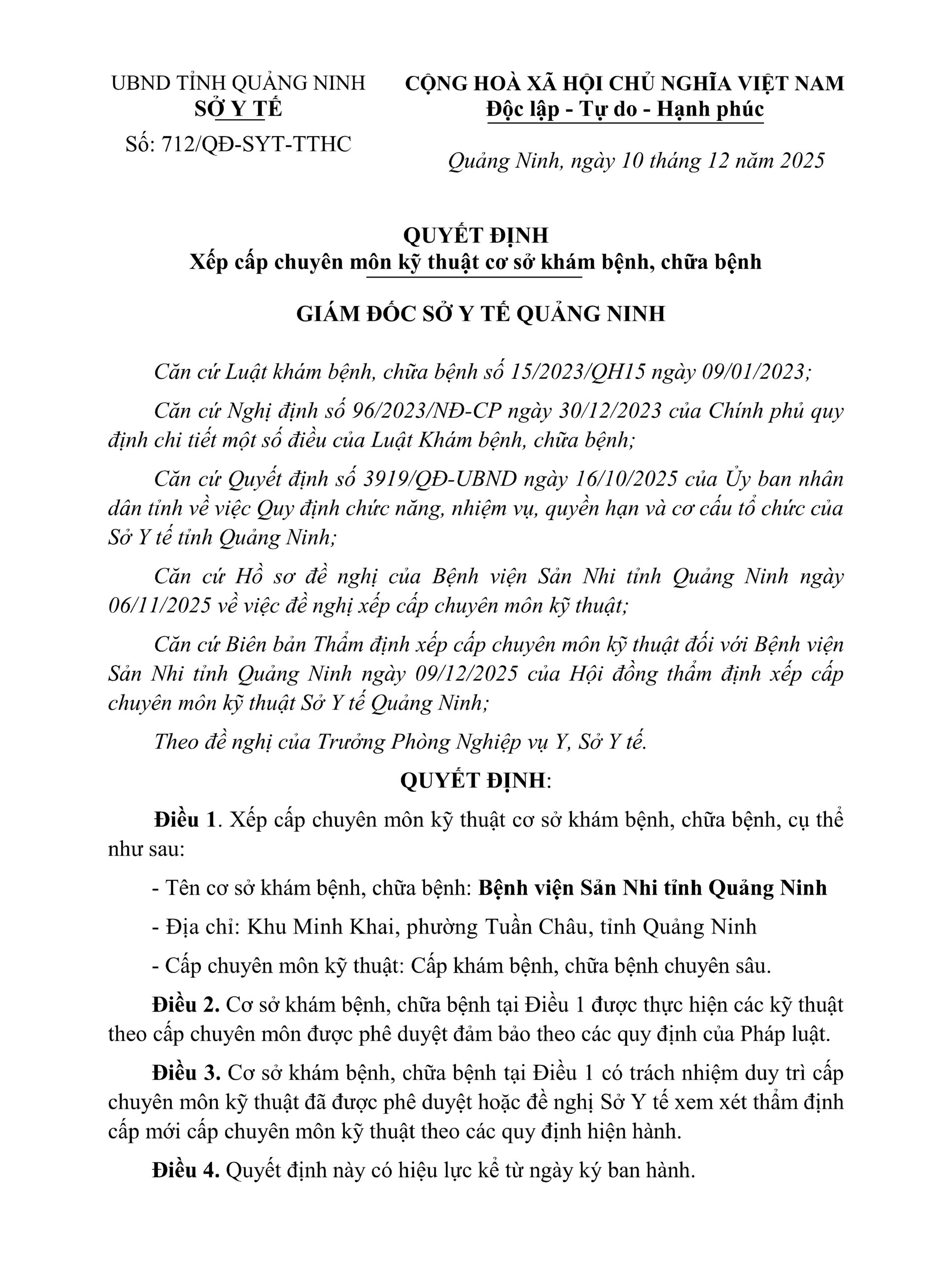 Sau khi thẩm định và đánh giá, Sở Y tế Quảng Ninh đã ban hành quyết định số: 712/QĐ-SYT-TTHC, Xếp cấp chuyên môn kỹ thuật cơ sở khám bệnh, chữa bệnh tại Bệnh viện Sản Nhi Quảng Ninh là Cấp khám bệnh, chữa bệnh chuyên sâu.