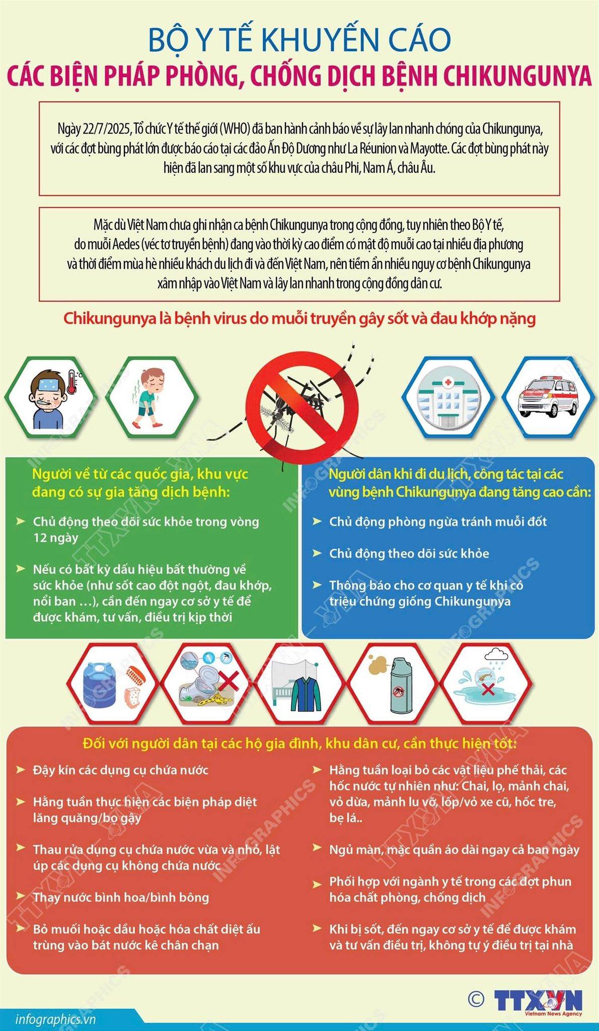 Bệnh Chikungunya tuy chưa có vắc xin phòng bệnh đặc hiệu, nhưng hoàn toàn có thể phòng ngừa hiệu quả nếu mỗi người, mỗi gia đình và cộng đồng chủ động diệt muỗi, diệt lăng quăng, phòng muỗi đốt. Chủ động phòng bệnh cho bản thân chính là bảo vệ sức khỏe cho cả cộng đồng.