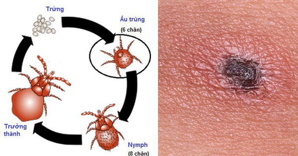Do vết đốt không đau nên người bệnh thường không chú ý. Sau khi bị đốt từ 6-12 ngày, bệnh nhân bắt đầu phát bệnh. Người bệnh có biểu hiện sốt cao liên tục, đau đầu, đau mỏi cơ, mệt mỏi, da và mắt thường xung huyết, có thể có ban đỏ trên da. Lúc đầu, tại nơi ấu trùng mò đốt có một nốt phỏng nước bằng hạt đỗ, sau đó vết đốt đóng vảy đen và khi bong vảy tạo thành vết loét nhỏ lõm như đáy giếng.