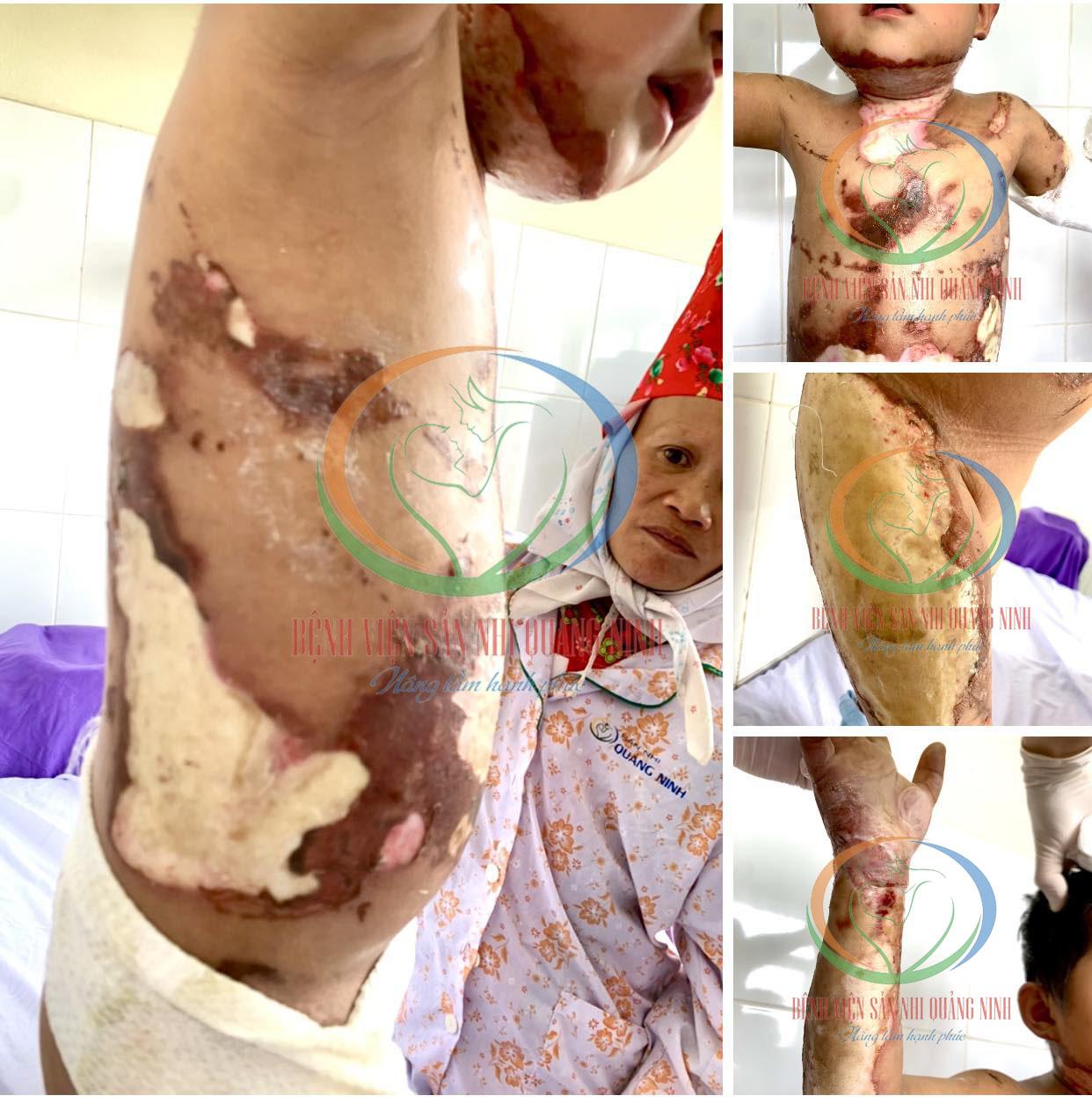 Bệnh nhi được sơ cứu kịp thời tại TTYT huyện Bình Liêu, sau đó chuyển đến Bệnh viện Sản Nhi tỉnh Quảng Ninh cấp cứu trong tình trạng đau đớn, kích thích, bỏng vị trí cổ, ngực, lưng, cánh tay trái, cẳng tay phải…