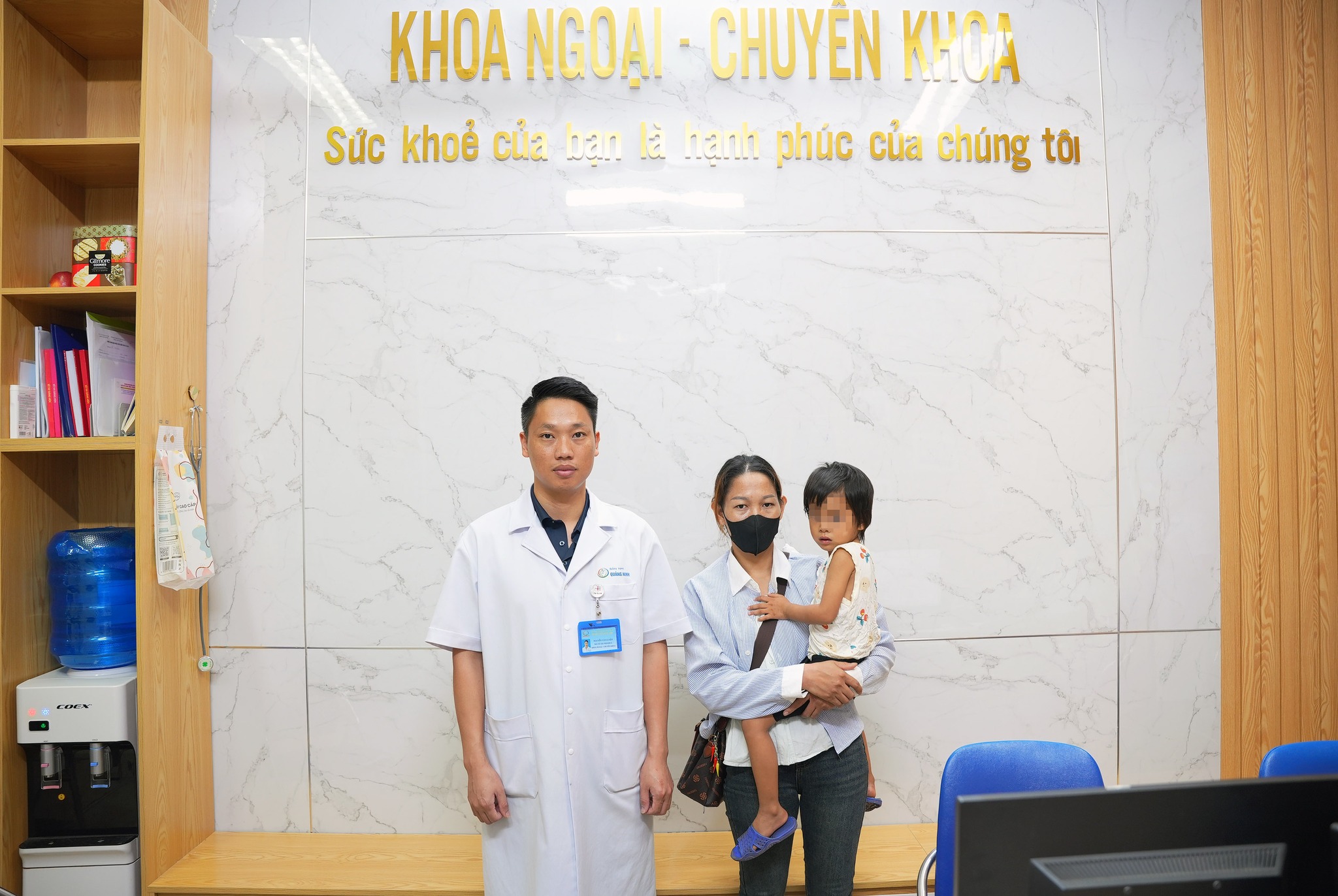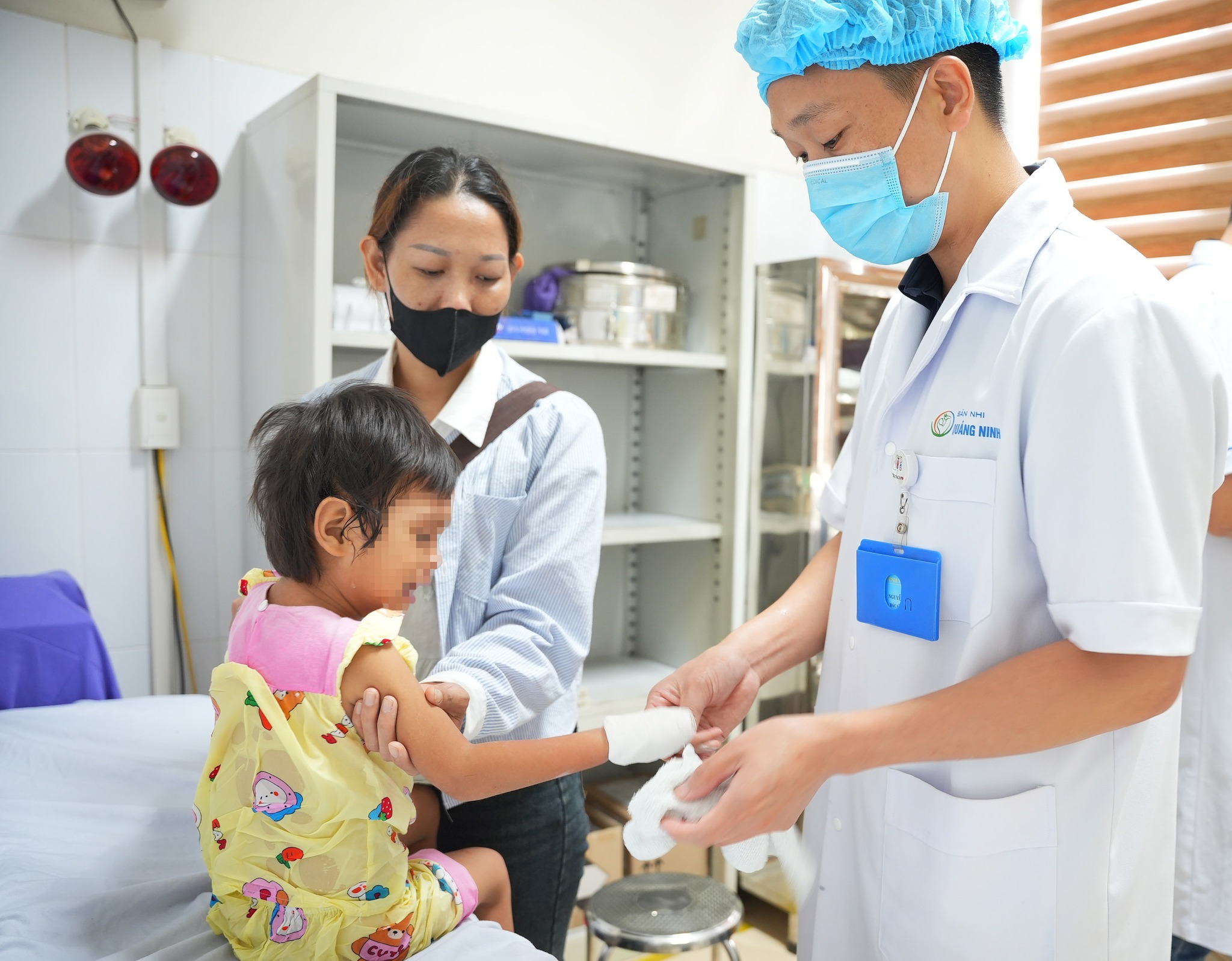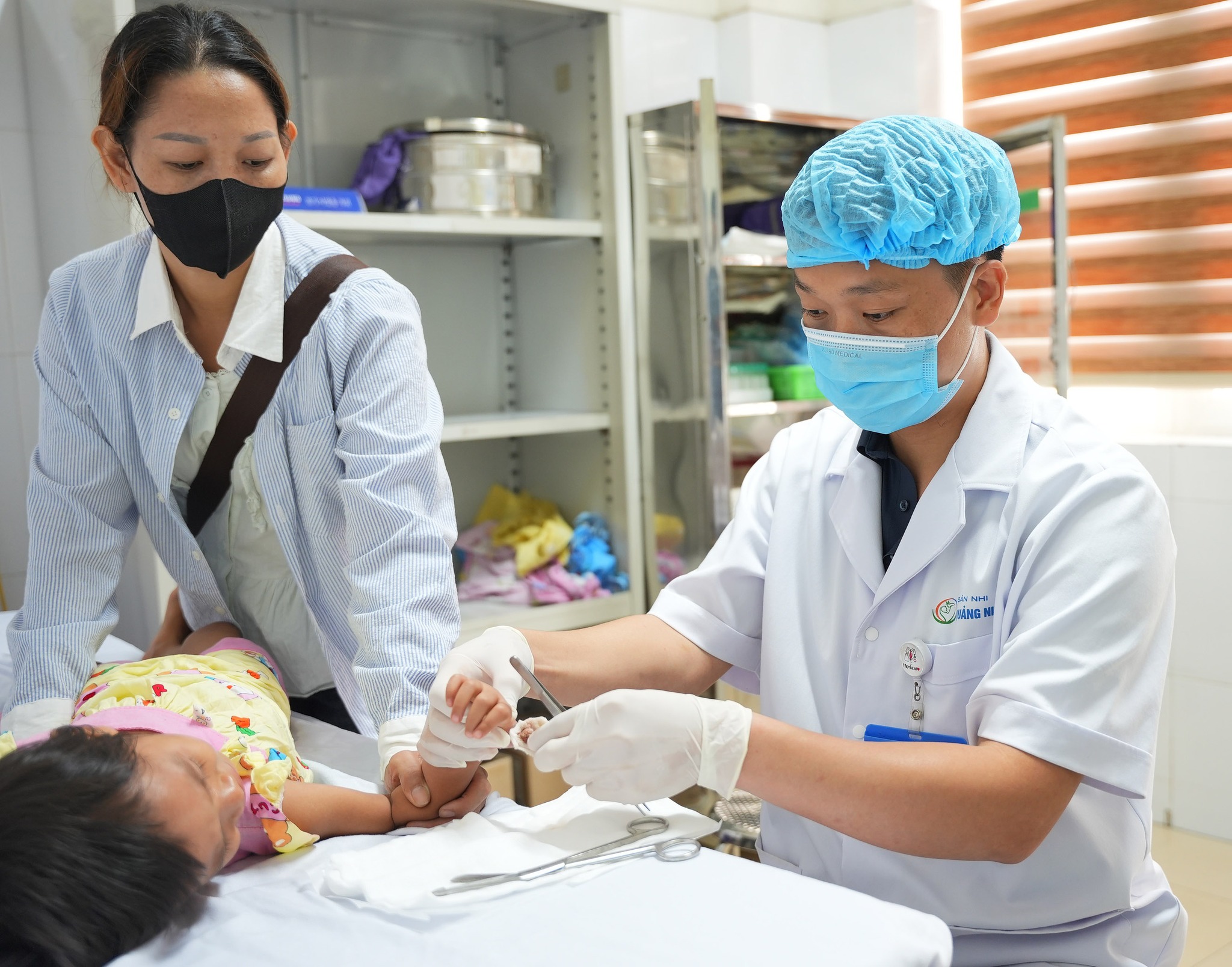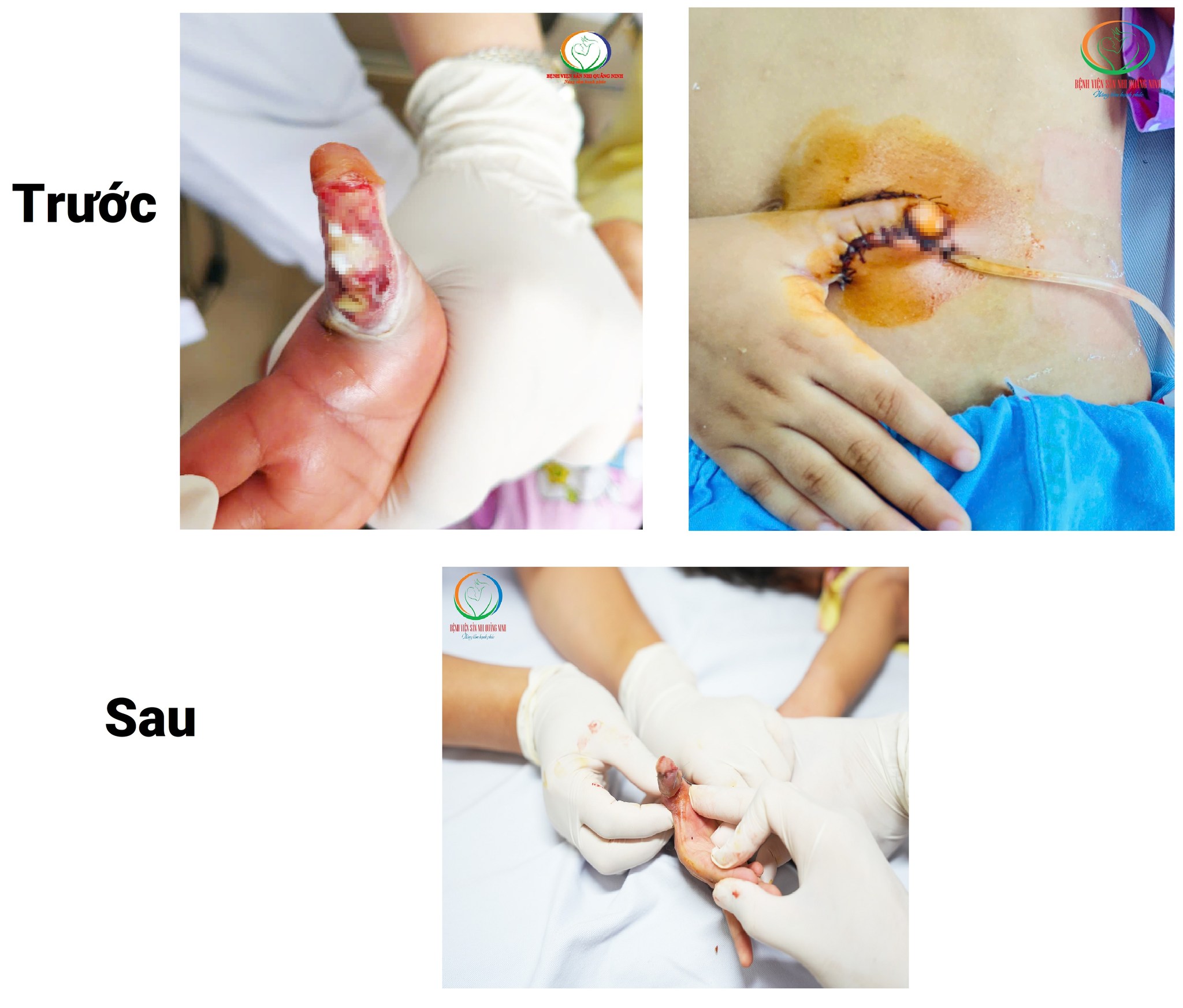 Vừa qua, Bệnh viện Sản Nhi Quảng Ninh tiếp nhận bệnh nhi P.T. T (43 tháng tuổi) dân tộc Dao, có hộ khẩu thường trú tại xã Đông Ngũ nhập viện trong tình trạng bỏng mặt gan ngón 1 tay phải, bỏng sâu lộ gân xương diện tích 1x2cm, vết thương nề, chảy dịch, có dấu hiệu hoại tử hết màng xương ngón 1.