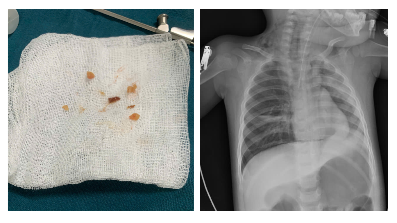 Theo lời kể gia đình, trong lúc được cho ăn kẹo lạc tại nhà trẻ bị hóc sặc, các mảnh vỡ bao gồm các hạt lạc và kẹo lọt sâu vào cả 2 bên phế quản dẫn đến tình trạng khó thở, tím tái, suy hô hấp nặng, trẻ li bì.