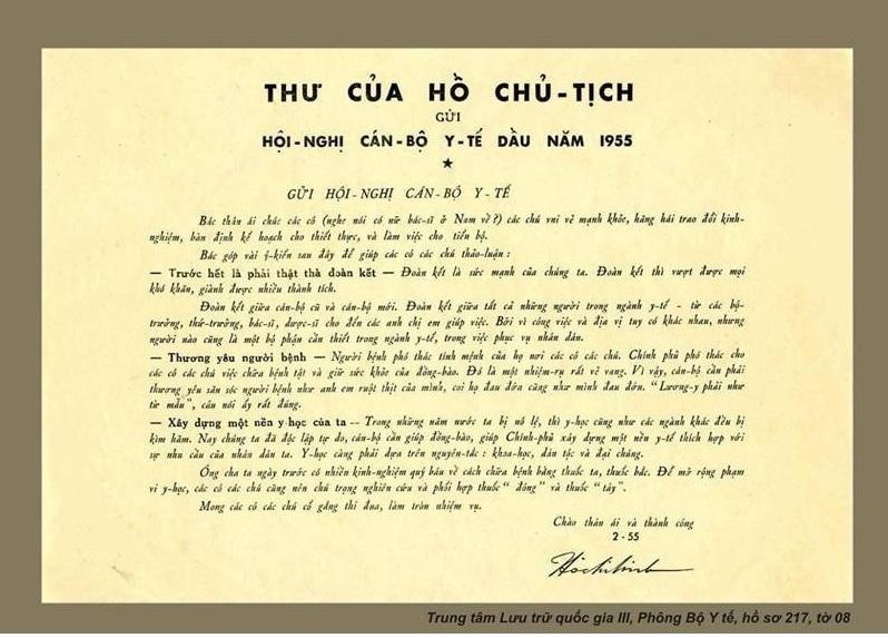 Vào ngày 27/02/1955, cách đây 69 năm, Chủ tịch Hồ Chí Minh đã viết thư gửi đến Hội nghị cán bộ y tế toàn quốc, trong thư Bác đã ân cần thăm hỏi, dành sự quan tâm đặc biệt đối với cán bộ y tế, đồng thời Bác cũng đã căn dặn: “phải thương yêu người bệnh; người bệnh phó thác tính mạng của họ với các cô, các chú; Chính phủ phó thác cho các cô các chú việc chữa bệnh tật và giữ gìn sức khoẻ của Đồng bào. Đó là một nhiệm vụ rất vẻ vang. Vì vậy, cán bộ y tế cần phải thương yêu chăm sóc người bệnh như anh em ruột thịt của mình; coi họ đau đớn cũng như mình đau đớn; lương y phải như từ mẫu, những lời căn dặn đó vẫn vang vọng, thấm sâu trong tâm trí của những người thầy thuốc Việt Nam.