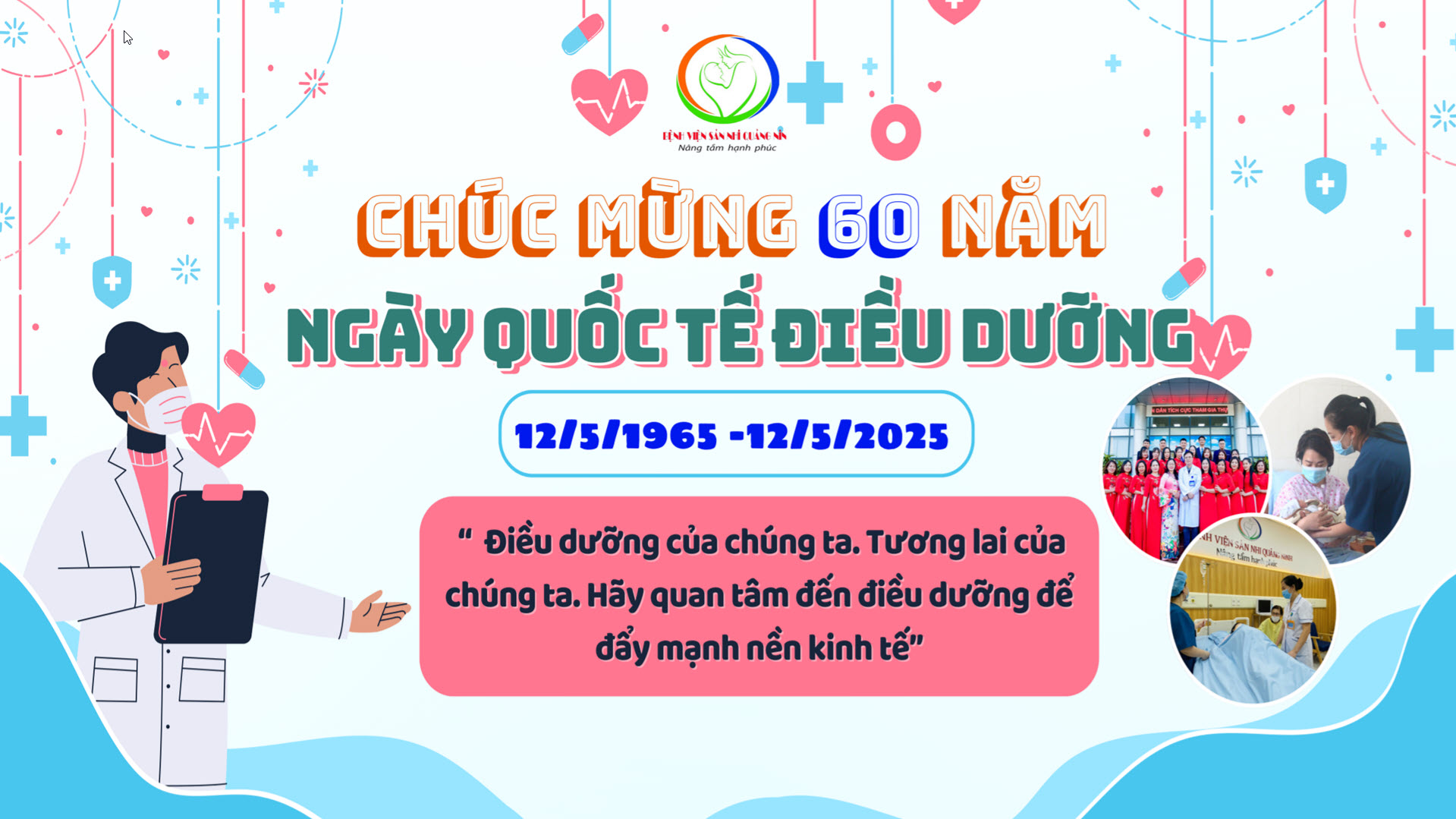 Nhân ngày Quốc tế Điều dưỡng, Bệnh viện Sản Nhi Quảng Ninh xin được gửi những lời chúc mừng tốt đẹp nhất tới các đồng nghiệp điều dưỡng viên, hộ sinh, kỹ thuật viên đã, đang và sẽ công tác tại bệnh viện nói riêng và trong ngành Y tế nói chung. Chúc các đồng nghiệp sức khỏe, hạnh phúc, thành công và dù công tác ở vị trí nào cũng thực hiện tốt nhiệm vụ của mình trong sự nghiệp chăm sóc và bảo vệ sức khỏe người dân
