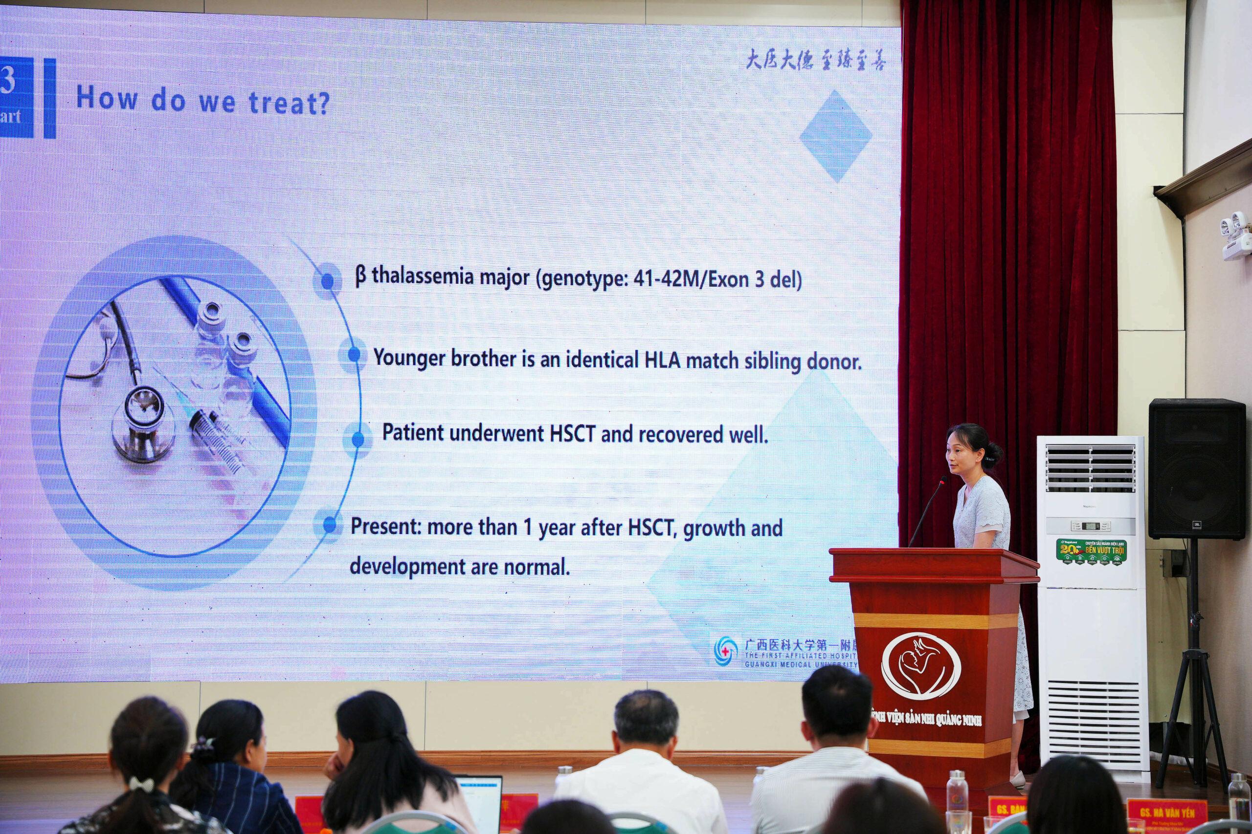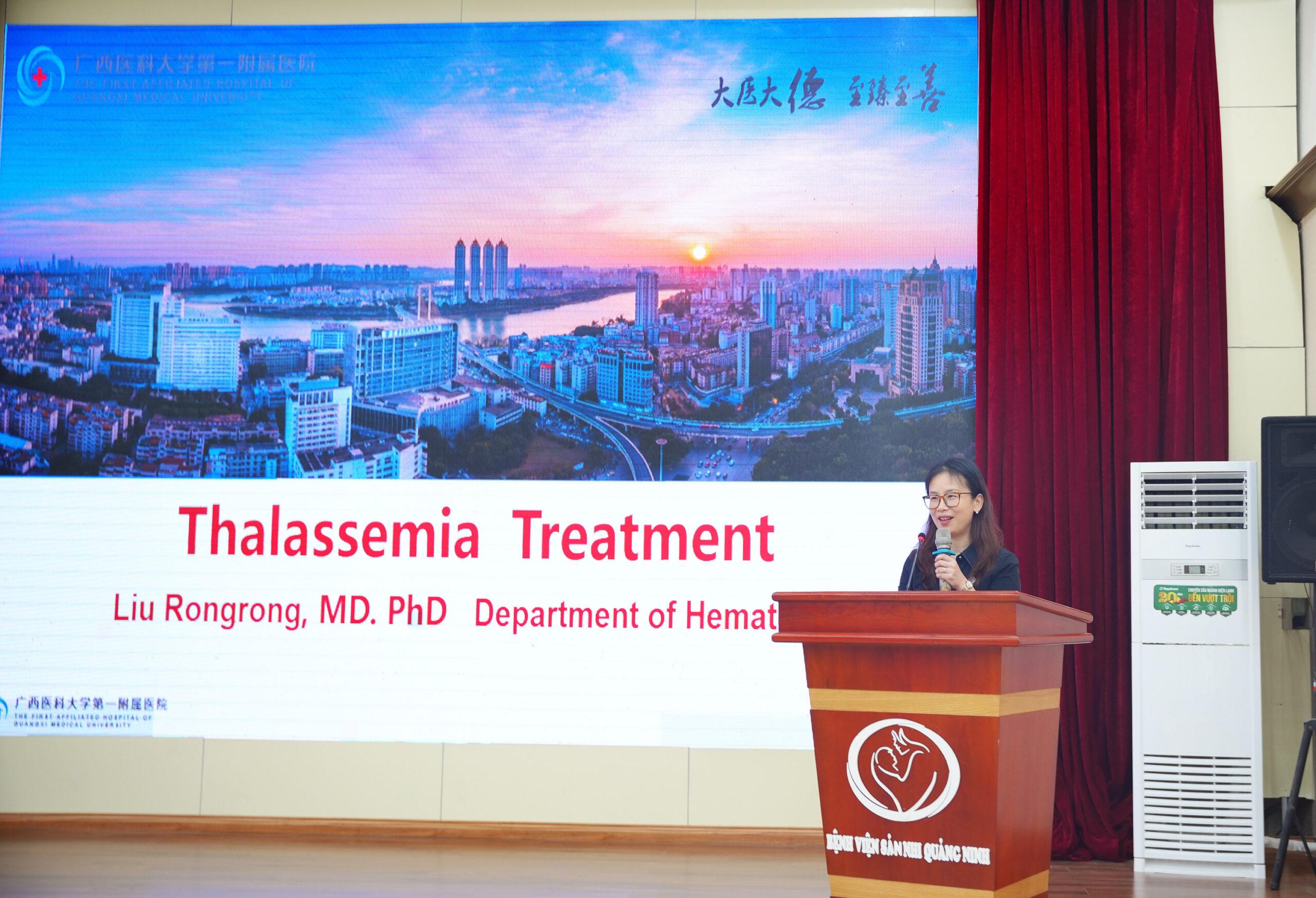 Chuyên gia đoàn công tác Bệnh viện số 1- Đại học Y Quảng Tây (Trung Quốc) trình bày nội dung chia sẻ kinh nghiệm về quản lý, chẩn đoán và điều trị bệnh Thalassemia