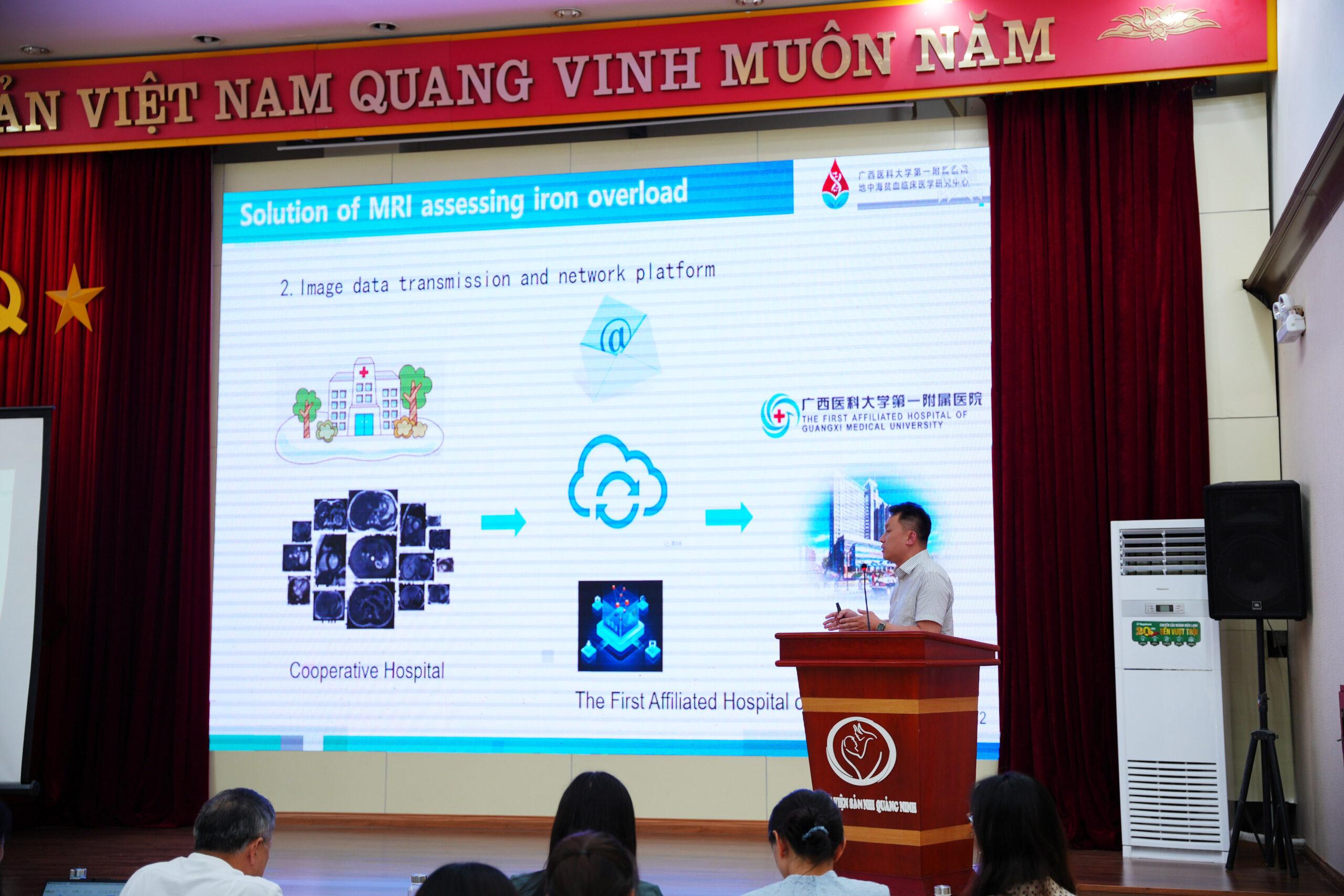 Cũng trong buổi Hội thảo, các chuyên gia nhiều kinh nghiệm của hai nước đã cùng nhau chia sẻ nhiều nội dung quan trọng như: Giới thiệu mô hình điều trị Thalassemia ở khoa Nhi, Bệnh viện Số 1, Đại học Y Quảng Tây (TQ); Phương pháp xác định hàm lượng lắng động sắt trong cơ thể qua phương pháp MRI và phẩm mềm truy cập chất sắt thông minh bằng công nghệ AI; Chia sẻ kinh nghiệm quản lý điều trị Thalassemia cho bệnh nhân người lớn tại Bệnh viện Đa khoa tỉnh, Bệnh viện Sản Nhi Quảng Ninh; Chẩn đoán trước sinh và can thiệp buồng tử cung (fetal intervention) trong phòng ngừa và điều trị bệnh Thalassemia; Giới thiệu phương pháp ghép tế bào gốc tạo máu và liệu pháp gen trong điều trị bệnh Thalassemia…, đồng thời các chuyên gia và đại biểu cũng cùng nhau thảo luận, bình bệnh án và đưa ra những phương án điều trị tối ưu cho một số trường hợp đang điều trị tại Bệnh viện Đa khoa tỉnh và Bệnh viện Sản Nhi Quảng Ninh.