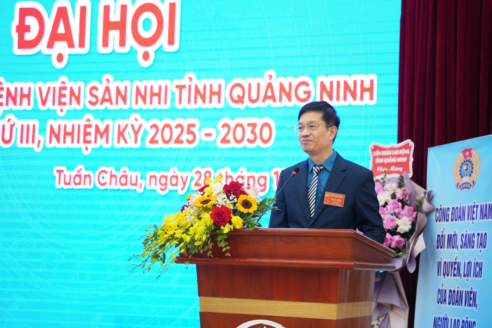 🎊Thay mặt Đảng bộ bộ phận Bệnh viện Sản Nhi Quảng Ninh, đồng chí Bùi Minh Cường- Bí thư Đảng bộ bộ phận, Giám đốc bệnh viện gửi lời chúc mừng và lẵng hoa tươi thắm chúc mừng Đại hội; Đồng chí Bí thư Đảng bộ bộ phận bệnh viện cũng ghi nhận những cố gắng và thành công đạt được trong nhiệm kỳ vừa qua của BCH Công đoàn bệnh viện nói riêng và mỗi tổ công đoàn trong việc chăm lo, nâng cao đời sống vật chất, tinh thần cho các đoàn viên bệnh viện; Đồng thời nhấn mạnh, việc sâu sát, nắm bắt những vấn đề phát sinh từ công đoàn cơ sở, đã giúp cho Ban lãnh đạo, BCH Đảng bộ, các cấp Chính quyền, công đoàn cấp trên kịp thời giải quyết tâm tư nguyện vọng, quyền lợi cho mỗi đoàn viên, giúp các đoàn viên, người lao động yên tâm công tác, tập trung cống hiến, nâng cao năng lực chuyên môn, góp phần đưa chất lượng khám chữa bệnh của bệnh viện ngày càng chuyên sâu, phát triển nhiều kỹ thuật mới, kỹ thuật cao trong công tác chăm sóc sức khỏe nhân dân.