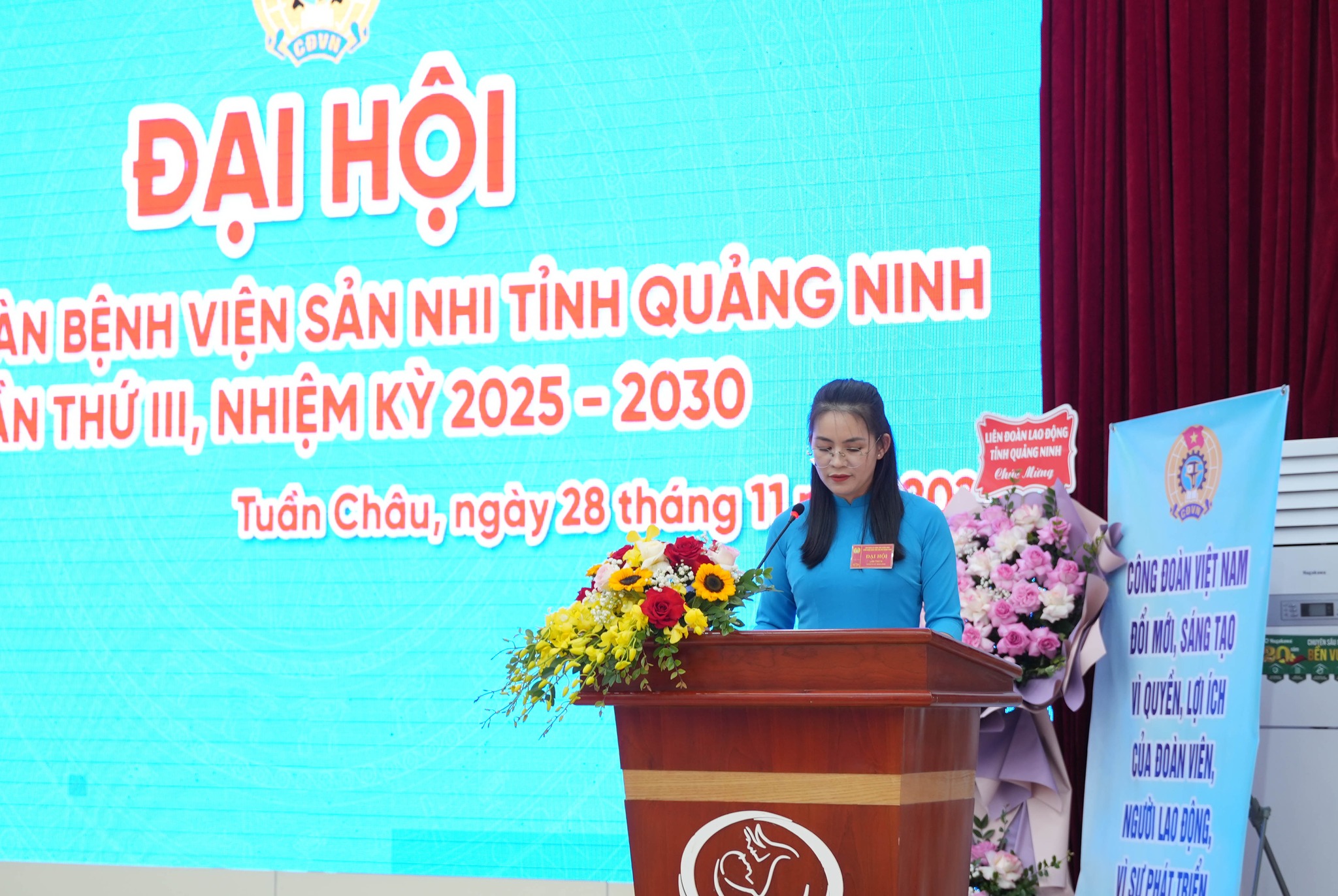 Chiều ngày 28/11, Công đoàn Bệnh viện Sản Nhi tỉnh Quảng Ninh đã long trọng tổ chức Đại hội Đại biểu Công đoàn lần thứ III nhiệm kỳ 2025-2030 nhằm tổng kết, đánh giá kết quả thực hiện Nghị quyết Đại hội Công đoàn Bệnh viện lần thứ II, nhiệm kỳ 2023-2025 và thông qua phương hướng, chỉ tiêu, nhiệm vụ giai đoạn 2025-2030.