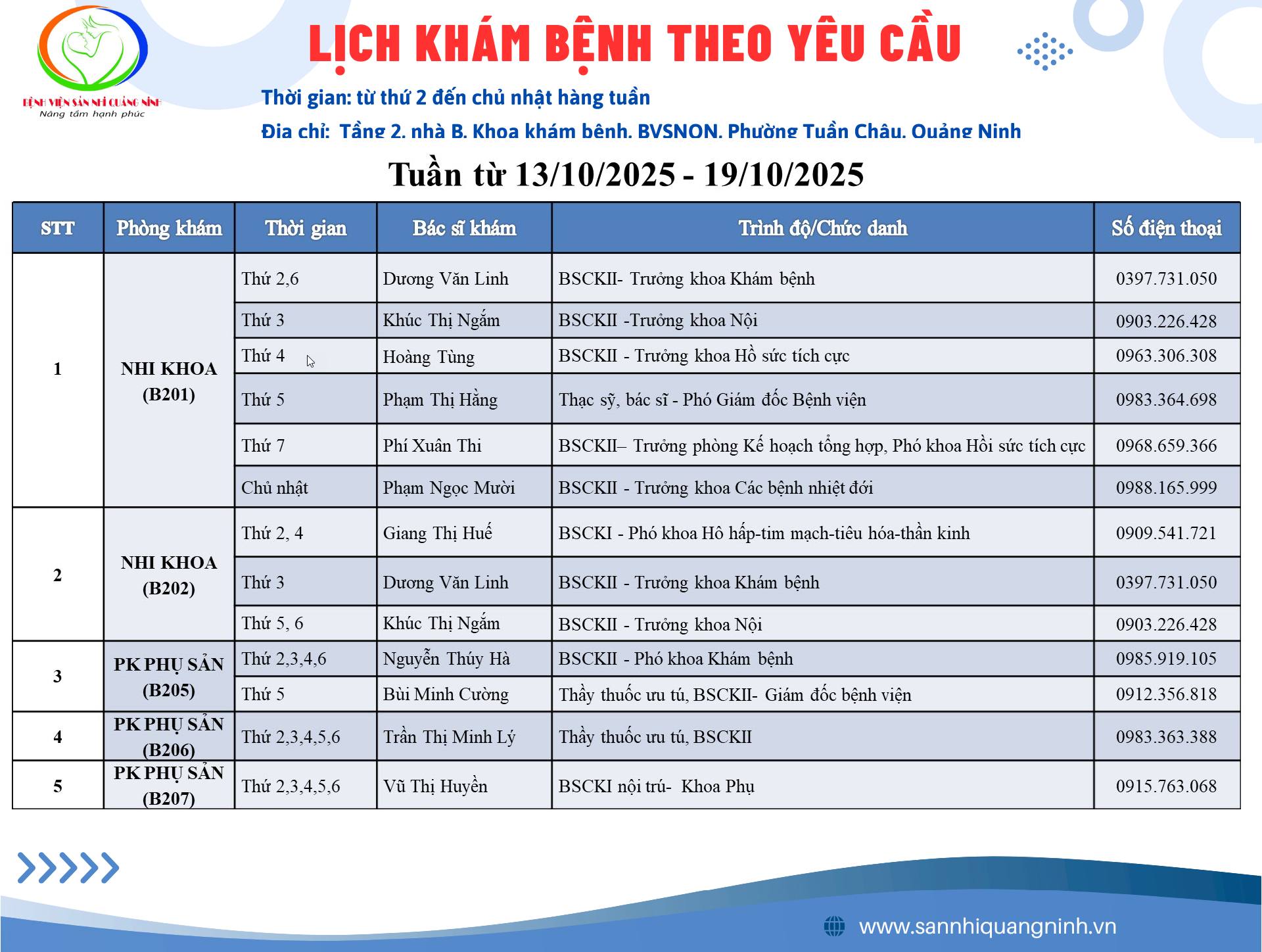 LỊCH KHÁM BỆNH THEO YÊU CẦU TẠI BỆNH VIỆN SẢN NHI QUẢNG NINH TỪ NGÀY 13/10/2025 – 19/10/2025 —————– Đăng ký khám trực tuyến bằng