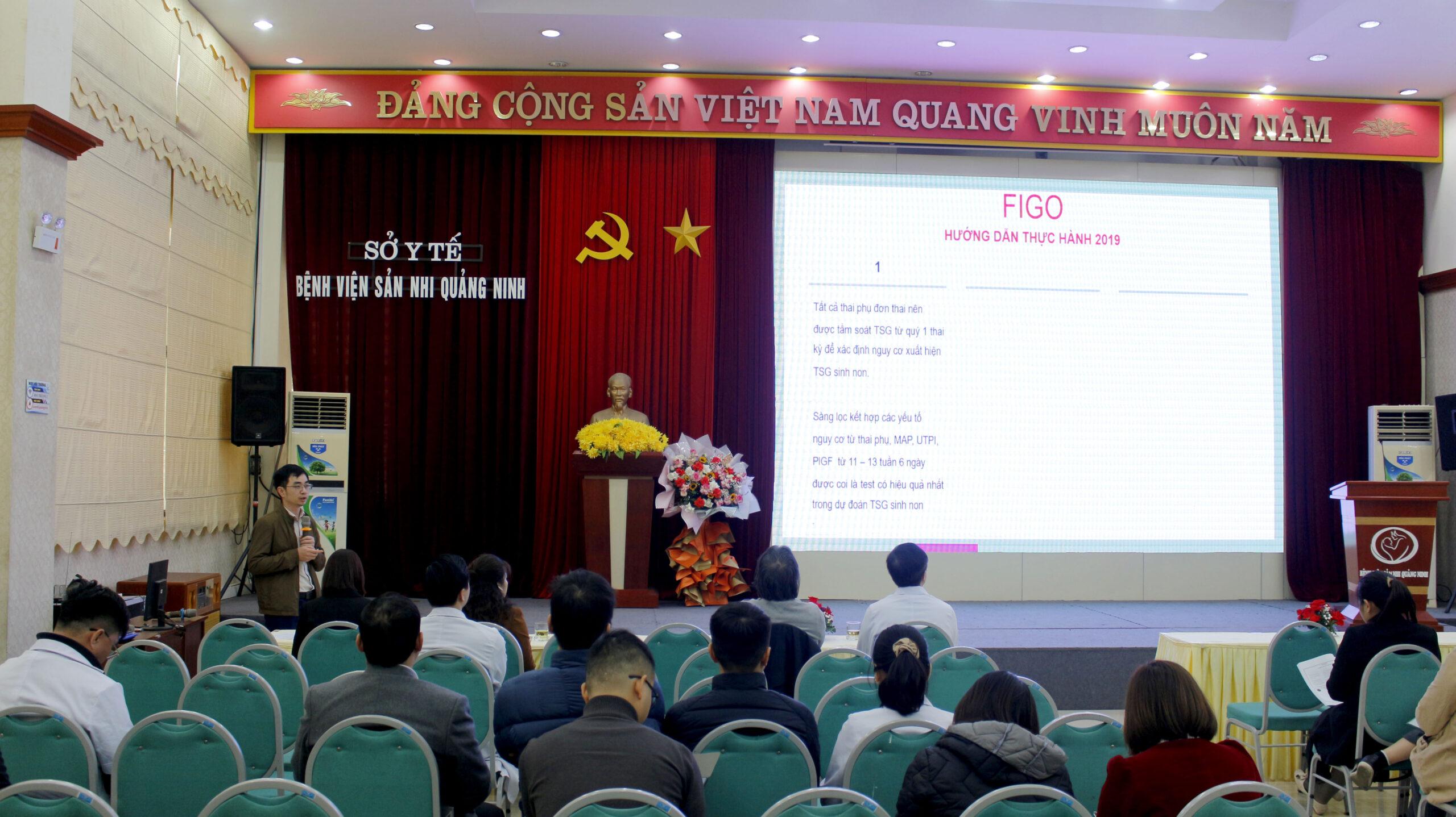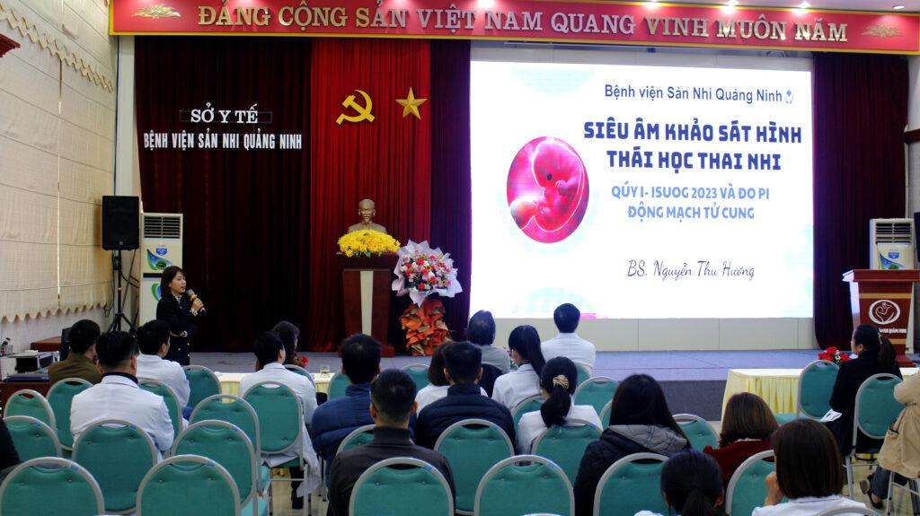 BSCKI. Trương Hữu Cương- Phụ trách đơn nguyên Chẩn đoán trước sinh – BVSNQN và BSCKI. Nguyễn Thu Hương – đơn nguyên Chẩn đoán trước sinh – BVSNQN cũng báo cáo tại buổi sinh hoạt nghiên cứu với chủ để: “ Quy trình sàng lọc tiền sản giật 3 tháng đầu thai kỳ tại Bệnh viện Sản Nhi quảng Ninh” và “Siêu âm khảo sát hình thái học thai nhi 3 tháng đầu và đo PI động mạch tử cung ”, qua đó cho thấy tầm quan trọng của siêu âm thai hình thái học 3 tháng đầu và tầm quan trọng của sàng lọc tiền sản giật 3 tháng đầu trong thai kỳ. Đồng thời hướng dẫn quy trình sàng lọc tiền sản giật 3 tháng đầu hiện đang triển khai tại BVSNQN cho toàn bộ các trung tâm y tế và bệnh viện trong tỉnh.