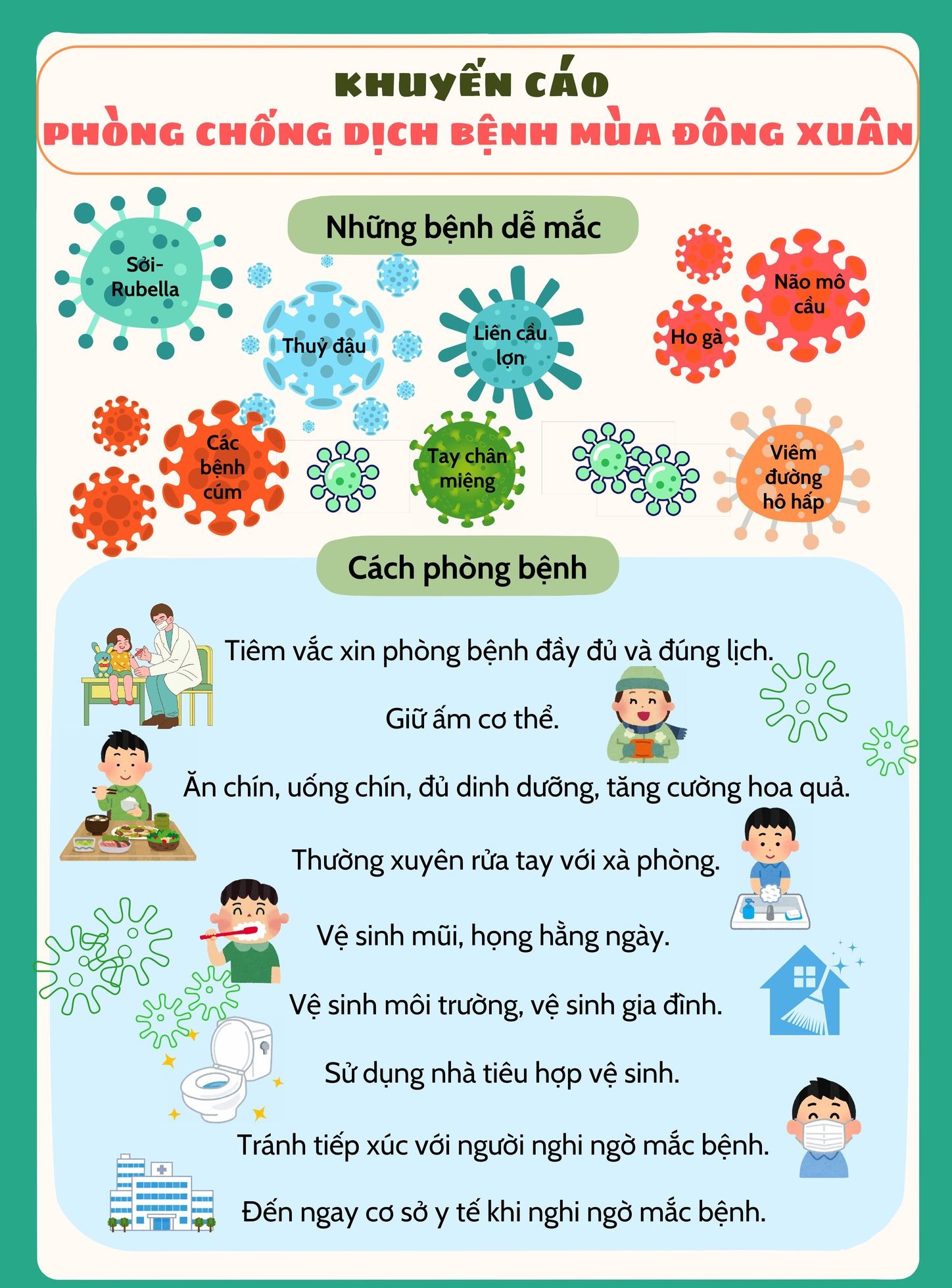Cũng theo Bác sĩ Linh: để chủ động phòng chống dịch bệnh mùa Đông – Xuân, người dân cần quan tâm, chủ động thực hiện các biện pháp nâng cao sức khỏe, phòng chống dịch bệnh như sau: