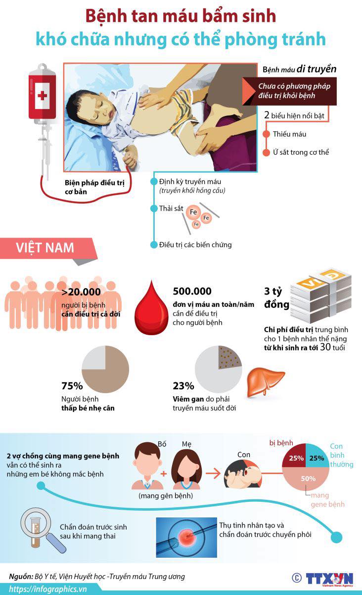 Trên thế giới bệnh tan máu bẩm sinh ảnh hưởng đến khoảng 300 triệu người, với khoảng 500.000 người mắc bệnh ở thể nặng. Ở nước ta có khoảng trên 13 triệu người mang gen bệnh TMBS, tương đương 13% dân số và có trên 20.000 người bệnh mức độ nặng cần phải điều trị cả đời. Mỗi năm có thêm khoảng 8.000 trẻ em sinh ra bị bệnh thalassemia, trong đó có khoảng 2.000 trẻ bị bệnh mức độ nặng và khoảng 800 trẻ không thể ra đời do phù thai. Người bị bệnh và mang gen có ở tất cả các tỉnh/thành phố, các dân tộc trên toàn quốc. Trong đó, tỷ lệ người dân đồng bào dân tộc miền núi chiếm tỷ lệ khá cao, từ 20-40% (do một trong những nguyên nhân chính là do kết hôn cận huyết).