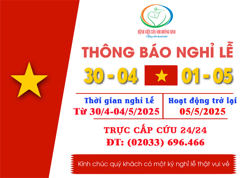 📣Để thuận tiện cho người dân có thể chủ động trong việc đặt lịch khám chữa bệnh, Bệnh viện Sản Nhi Quảng Ninh trân trọng thông báo thời gian nghỉ Lễ 30/4 – 01/5 năm 2025 như sau: