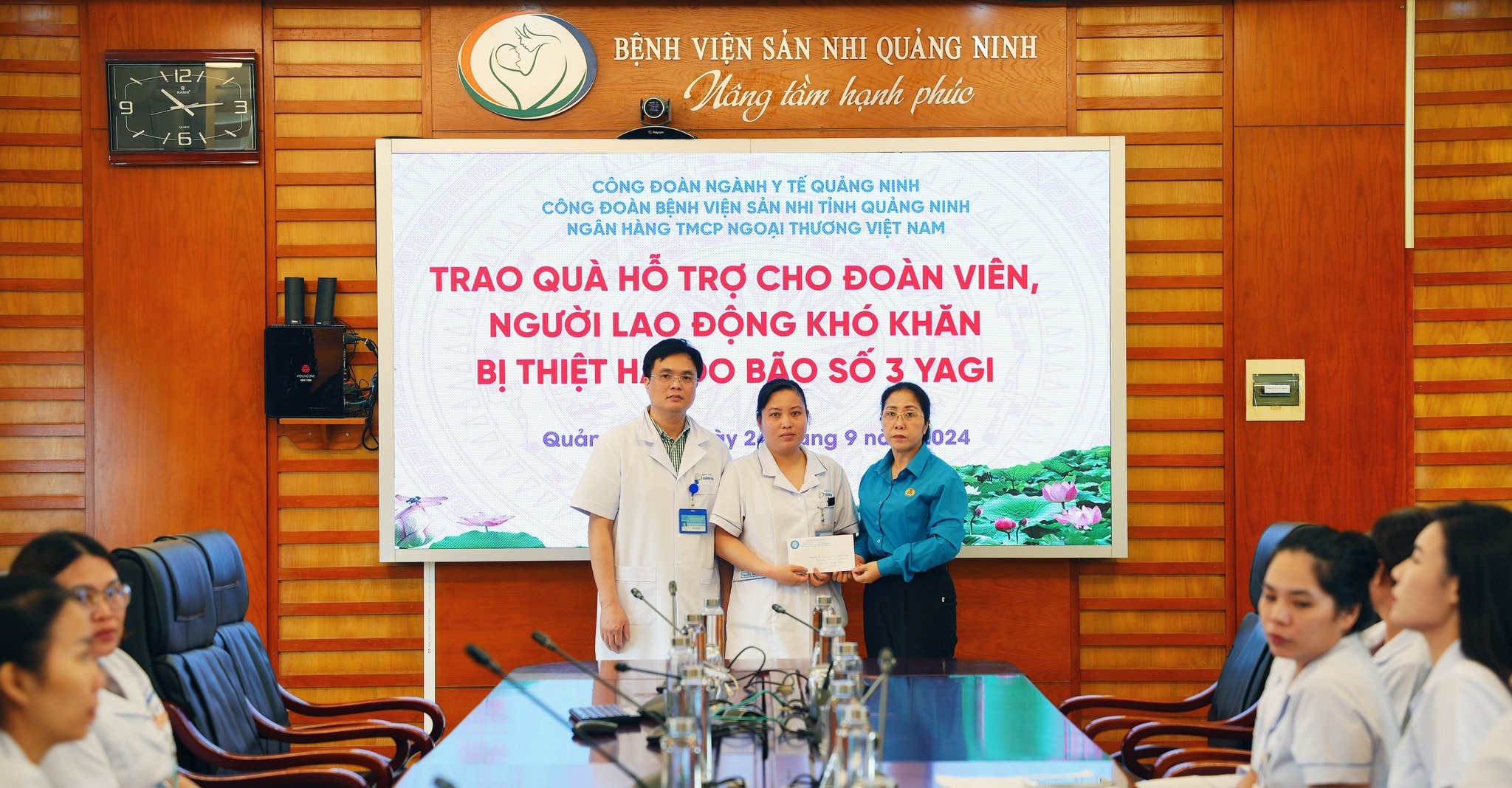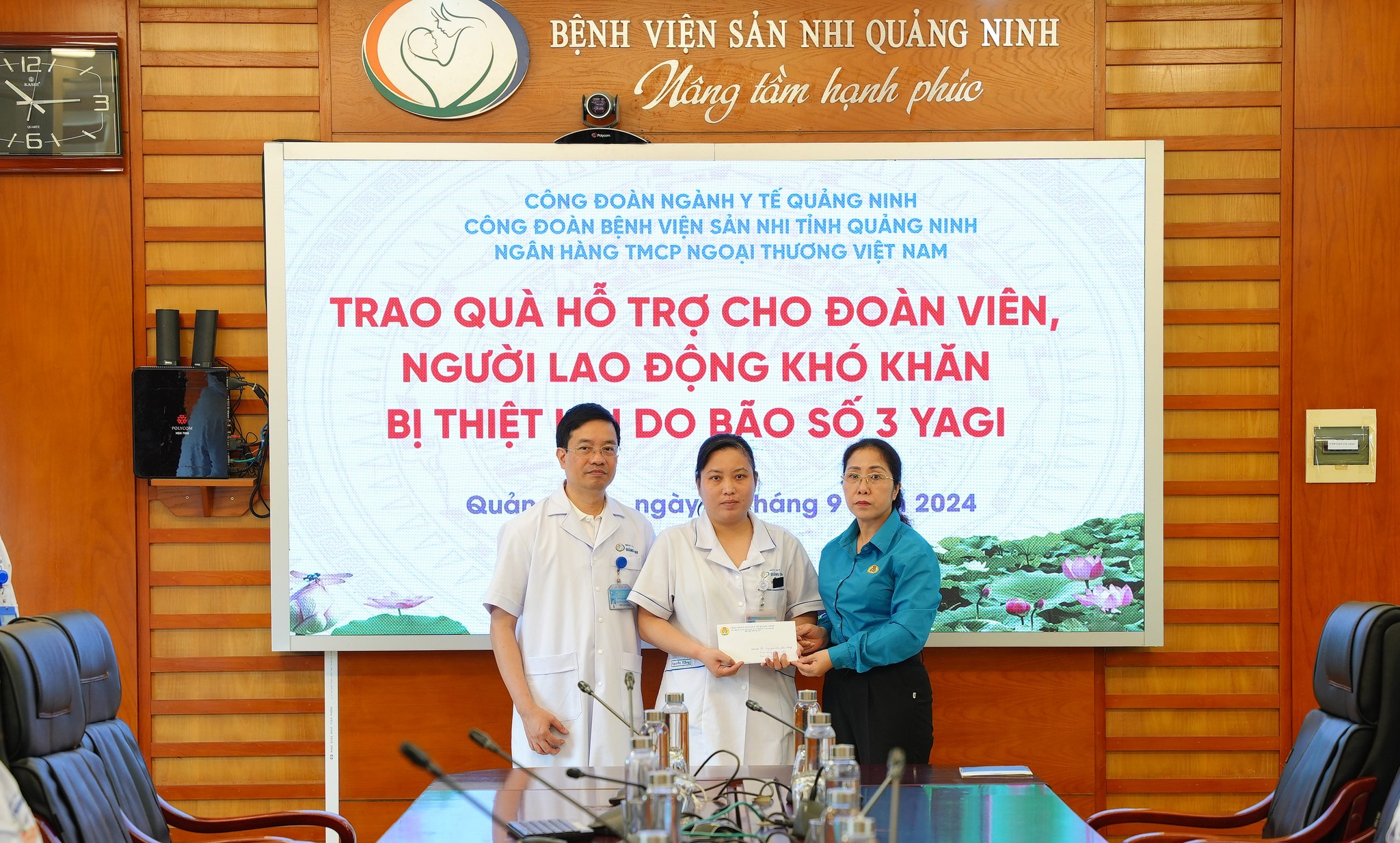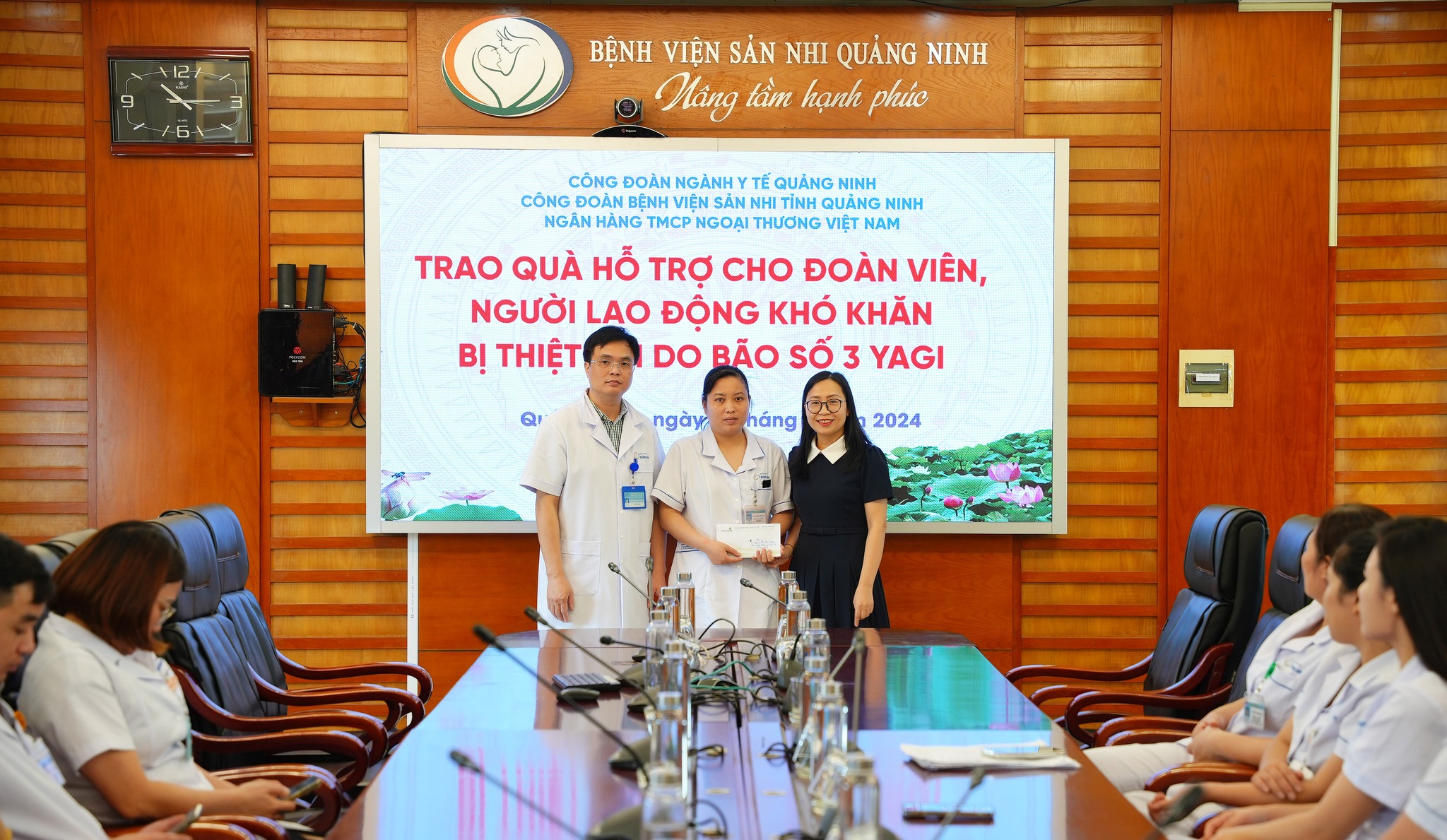 Nhân dịp này, được sự quan tâm của LĐLĐ tỉnh, thừa ủy quyền của Giám đốc Sở Y tế, Công đoàn ngành Y tế Quảng Ninh đã trao tặng 01 suất quà trị giá 05 triệu đồng và Ngân hàng TMCP Vietcombank trao 01 suất quà trị giá 10 triệu đồng tới đoàn viên Bệnh viện Sản Nhi Quảng Ninh gặp hoàn cảnh đặc biệt khó khăn do bão số 3 gây ra nhằm động viên, mong muốn đồng chí đoàn viên sớm ổn định cuộc sống, yên tâm công tác, hoàn thành tốt nhiệm vụ chăm sóc và bảo vệ sức khỏe cho nhân dân.
