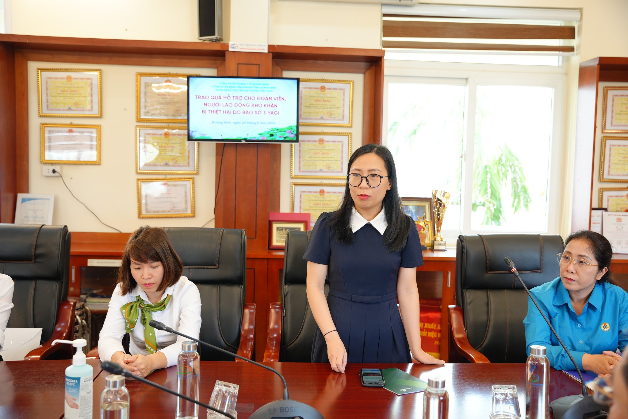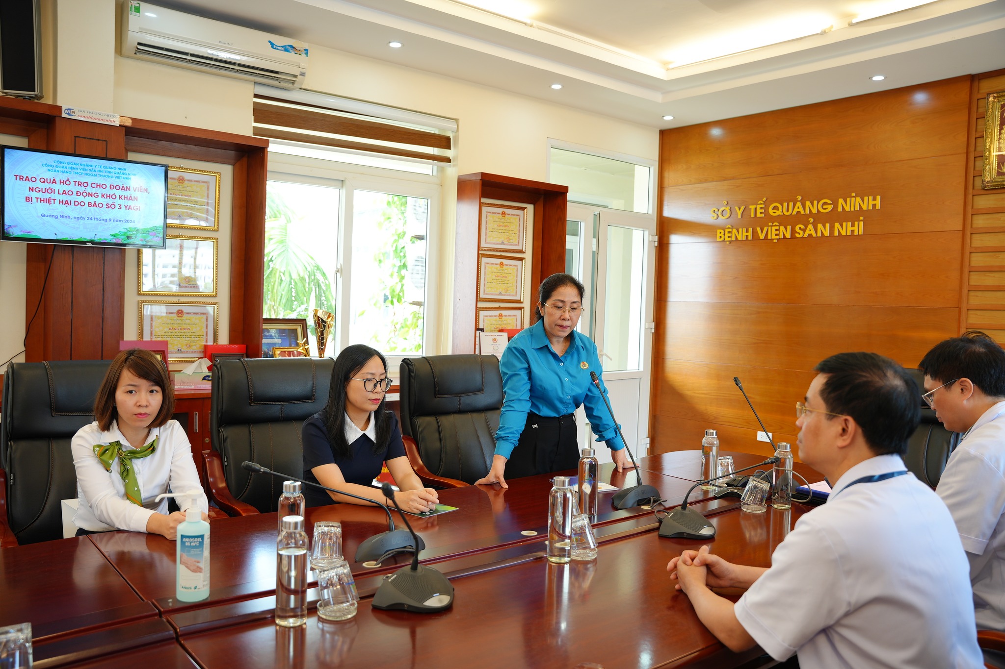 Thay mặt Bệnh viện Sản Nhi Quảng Ninh, đồng chí Bùi Minh Cường- Giám đốc bệnh viện gửi lời cảm ơn sâu sắc tới Lãnh đạo Liên đoàn lao động tỉnh, Lãnh đạo Sở Y tế và Công đoàn Ngành Y tế Quảng Ninh đã luôn bám sát, nắm bắt tình hình và có sự quan tâm, động viên, hỗ trợ kịp thời cả về tinh thần và vật chất cho các đoàn viên công đoàn tại Bệnh viện Sản Nhi Quảng Ninh; Đồng chí Giám đốc cũng chia sẻ: trước đó, sau khi nắm bắt tình hình các đoàn viên bệnh viện bị thiệt hại, mất mát to lớn do siêu bão Yagi gây ra, bệnh viện đã kịp thời có các hoạt động cần thiết để hỗ trợ trực tiếp và động viên gia đình các đồng chí đoàn viên; Mặc dù thiệt hại về cơ sở vật chất bệnh viện và các gia đình đoàn viên trong viện là rất hại nặng nề; nhưng mất mát về người là mất mát đặc biệt to lớn không gì tính được, do đó toàn Ngành Y tế và Bệnh viện Sản Nhi Quảng Ninh rất sẻ chia với gia đình đồng chí đoàn viên, đồng thời cũng mong muốn với ý chí, nghị lực và tinh thần đoàn kết, chung tay của cộng đồng, đồng chí đoàn viên và gia đình sẽ sớm vượt qua để ổn định cuộc sống.