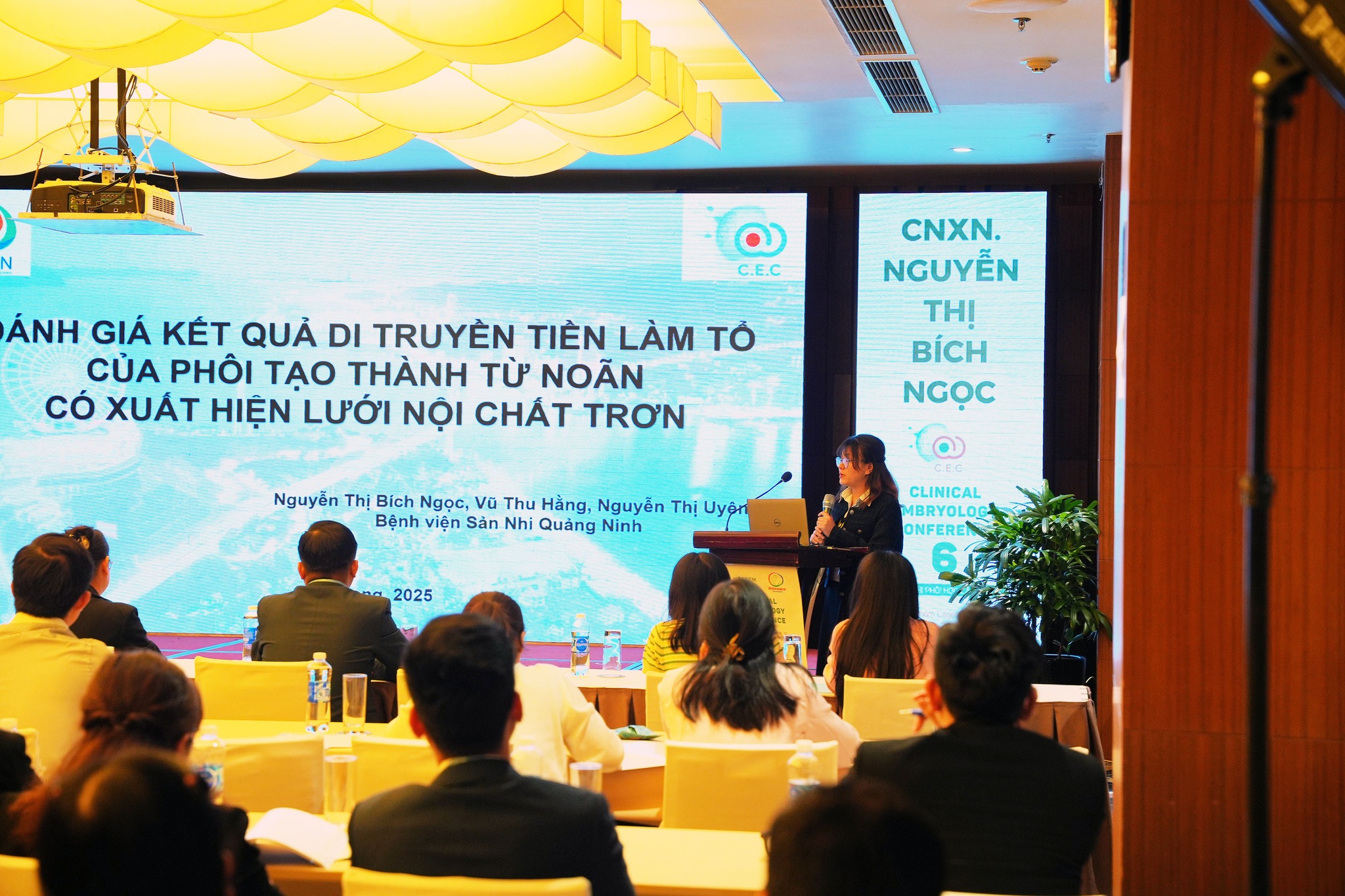 Tại các phiên 1B, 2B và 3B của Hội thảo, các báo cáo viên Lê Thảo Ly, Vũ Thu Hằng, Nguyễn Thị Bích Ngọc đến từ khoa Hỗ trợ sinh sản –BVSNQN đã lần lượt trình bày các báo cáo khoa học chuyên đề về di truyền, phôi học, hỗ trợ sinh sản : “Đánh giá tý lệ trẻ sinh sống sau chẩn đoán phôi trước làm tổ (PGT M) bệnh thalassemia tại Bệnh viện Sản Nhi Quảng Ninh từ năm 2022 – 2024”; “Ảnh hướng cúa sự xuất hiện không bào trong quá trình nuôi cấy đến chất lượng phôi nang tạo thành”; “Đánh giá kết quá di truyền tiền làm tổ của phôi tạo thành từ noãn có xuất hiện lưới nội chất trơn”