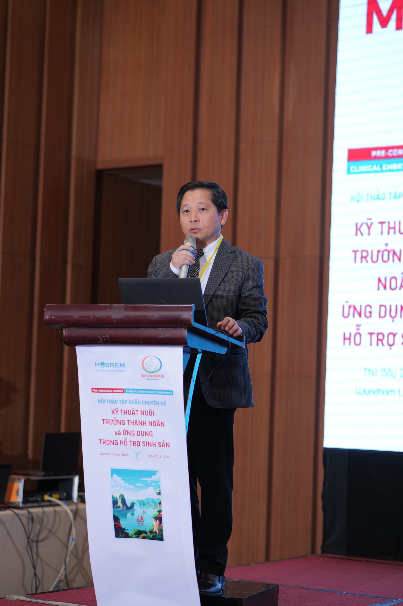 Điều đặc biệt tại phiên Hội thảo Tập huấn chuyên đề tiền Hội nghị về: “Kỹ thuật nuôi trưởng thành noãn và ứng dụng trong hỗ trợ sinh sản” là có sự tham gia và giảng dạy của rất nhiều chuyên gia hàng đầu trong nước và thế giới về IVM ( Kỹ thuật Trưởng thành trứng non trong ống nghiệm) đó là: Giáo Johan Smitz- GS trường Đại học Tự do Brussels (VUB), Bỉ, là người phát kiến ra phác đồ IVM 2 pha nổi tiếng; Tiến sĩ Joseph Conaghan – Giám đốc khoa học và đào tạo của chuỗi trung tâm IVF hàng đầu Hoa Kỳ CCRM, có 34 chi nhánh khắp nước Mỹ, nổi tiếng thế giới trong lãnh vực Phôi học lâm sàng với bài nghiên cứu: “các tiến bộ gần đây trong kỹ thuật thuỷ tinh hoá (vitrification)”; ThS. BS. Hồ Mạnh Tường – Tổng thư ký Hội Nội Tiết Sinh Sản và Vô Sinh TPHCM. (Horesm) với bài giảng: “ Các phát kiến lớn của chuyên ngành Phôi học lâm sàng từ 1978”; PGS. TS. Vương Thị Ngọc Lan – Phó Hiệu trưởng, Trường Đại học Y Dược TPHCM với công bố: “Kết quả áp dụng CAPA-IVM ở Việt Nam (2016-2024)”