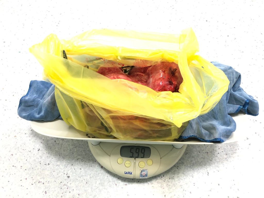 Qua hội chẩn chuyên khoa, các bác sĩ chẩn đoán u xơ tử cung, chỉ định phẫu thuật cắt tử cung hoàn toàn cho bệnh nhân. Tiến hành phẫu thuật, các bác sĩ đã lấy ra khối u xơ nặng 5,99kg. Hiện tại, sức khỏe bệnh nhân ổn định.