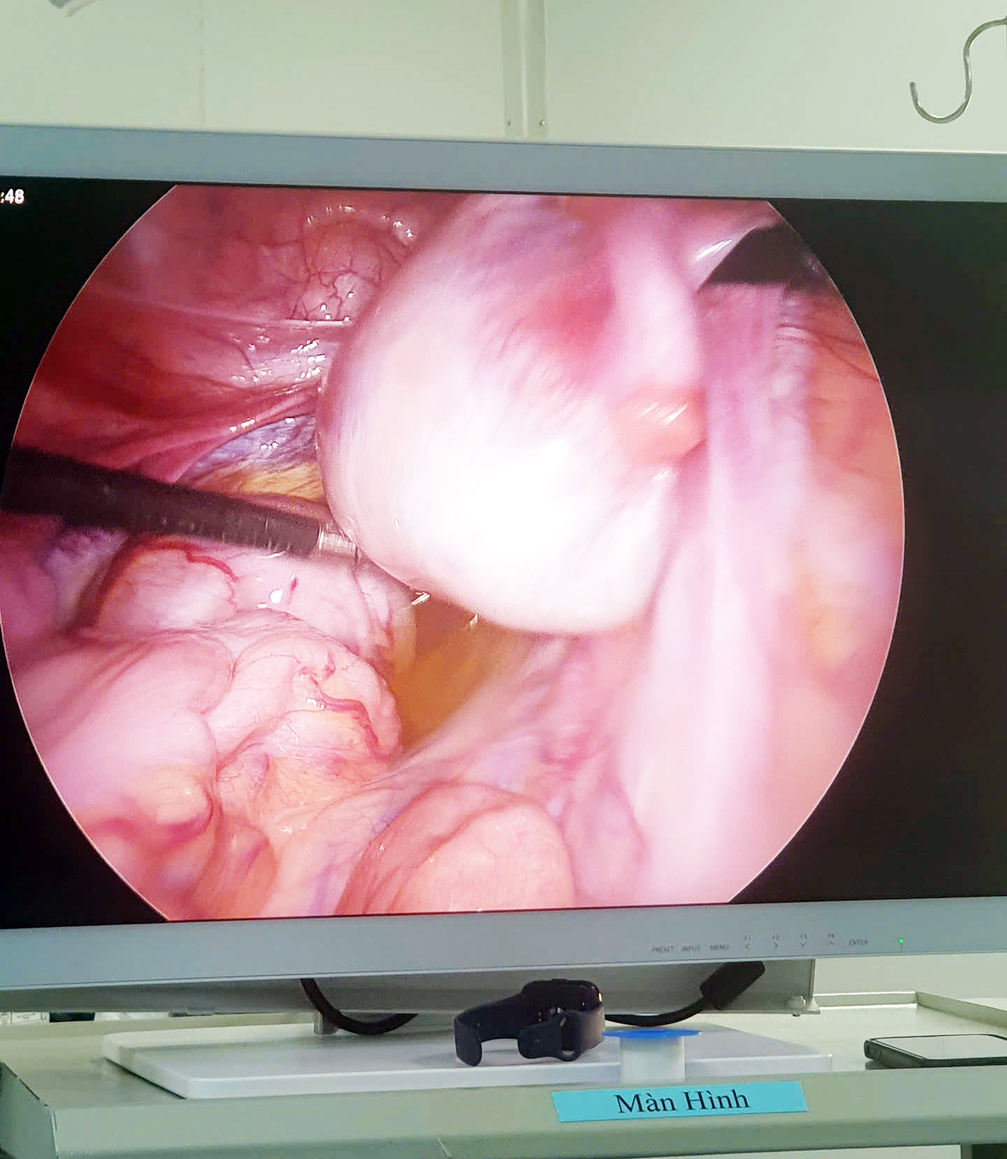 🩻Kết quả siêu âm, chụp cắt lớp vi tính cho thấy: Hình ảnh buồng trứng phải có khối dạng nang bì trong có tổ chức dịch, mô tỷ trọng dạng xương, KT 50 x 45 mm. Qua hội chẩn chuyên khoa các bác sĩ chẩn đoán U bì buồng trứng phải và chỉ định Phẫu thuật nội soi cắt u bì buồng trứng dưới gây mê nội khí quản cho bệnh nhân.