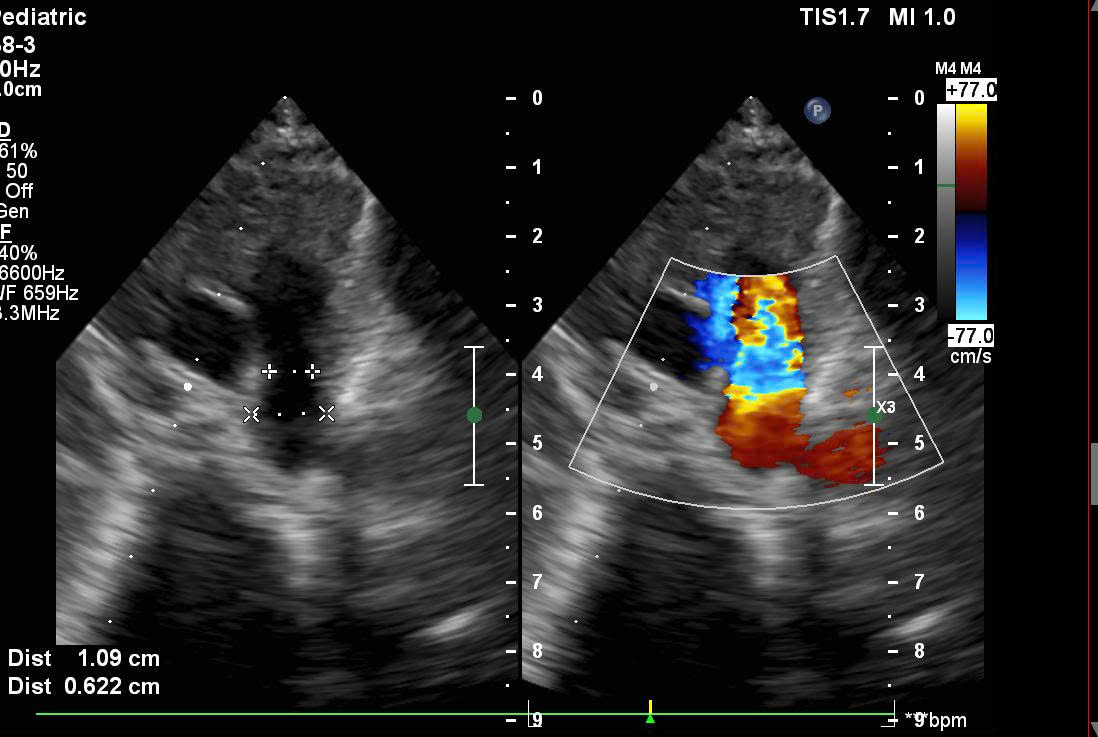Từ các kết quả cận lâm sàng và Siêu âm Doppler tim, van tim cho thấy trẻ còn ống động mạch lớn đường kính phía phổi 4.6mm, đường kính phía chủ 9.1mm, hở van ba lá trung bình, Pgmax qua van ba lá 57mmhg; điện tim thường: nhịp xoang tần số 128 chu kỳ/phút; Các bác sĩ đã hổi chẩn chuyên khoa và chỉ định phẫu thuật bệnh tim bẩm sinh đóng ống động mạch, phương pháp Gây mê nội khí quản.