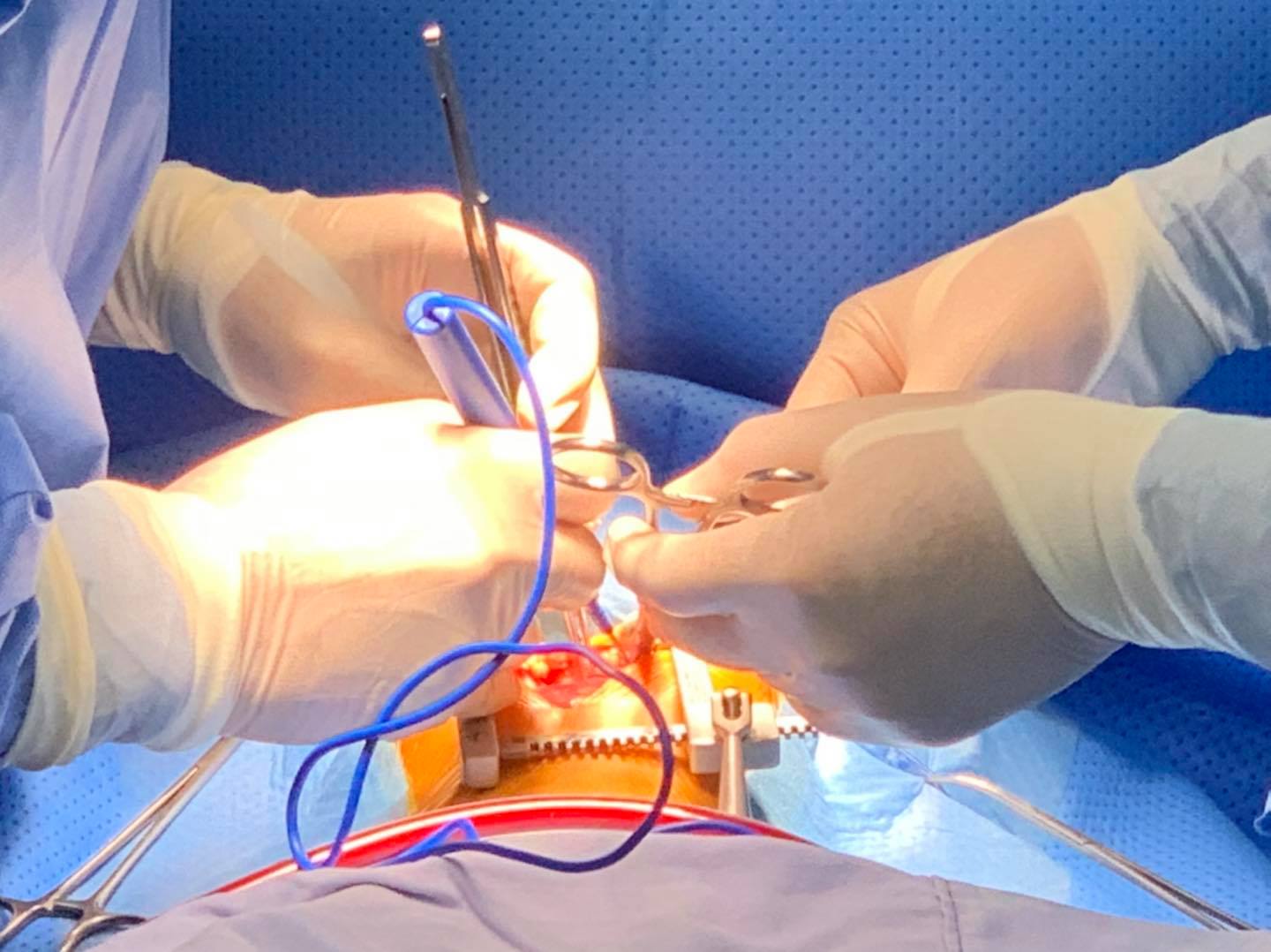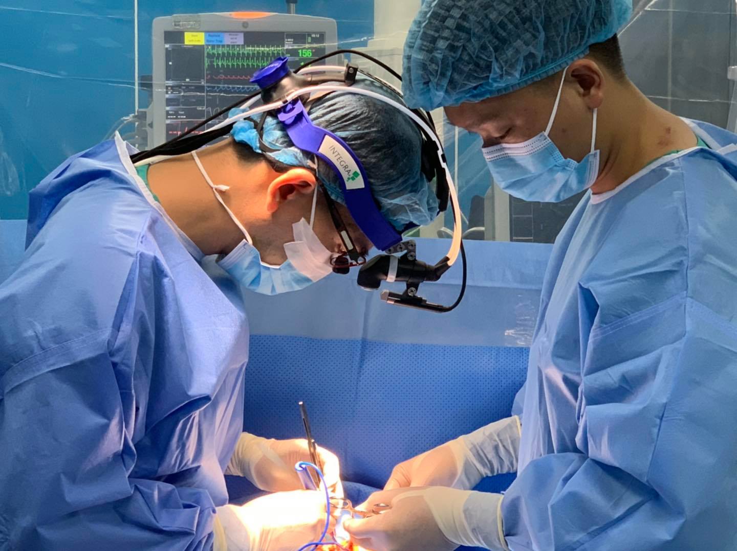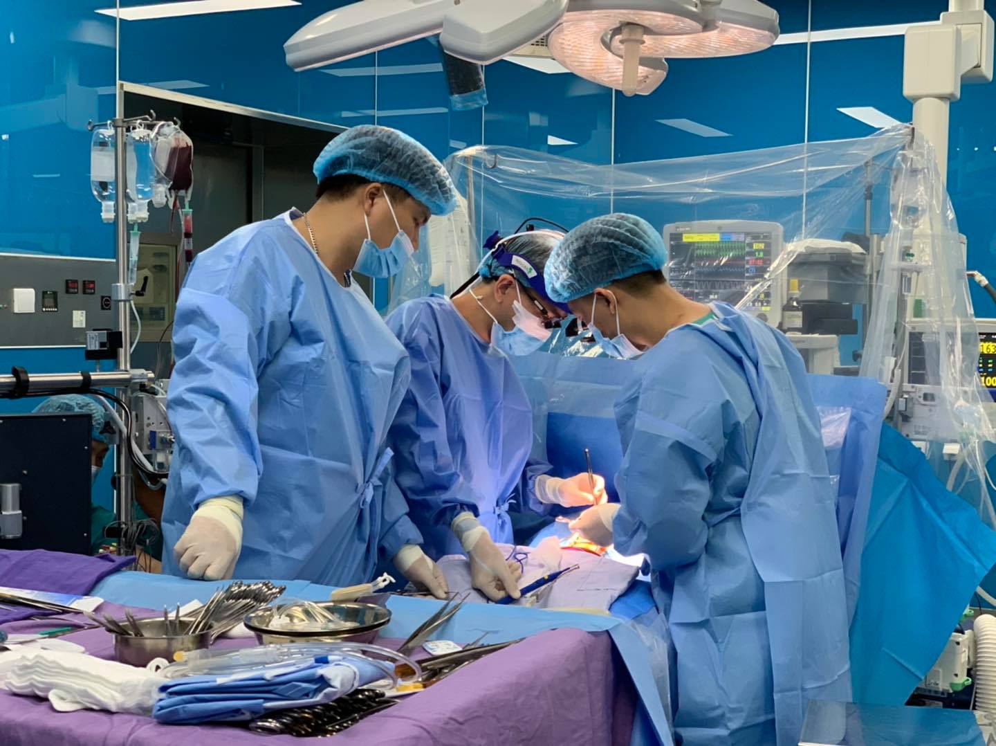 Các bác sĩ tiến hành thiết lập hệ thống máy tuần hoàn ngoài cơ thể tại chỗ và tiến hành mở ngực, mở màng tim…, mở nhĩ phải, qua van bá lá thấy lỗ thông phần màng làn xuống phía van chủ kích thước ~ 8mm, các bác sĩ tiến hành khâu kín chu vi ống thông liên thất bằng 8 mũi chỉ Prolen6/0, Khâu kín lỗ thông bằng miếng vá nhân tạo, đóng nhĩ phải…, đóng lồng ngực. Kíp phẫu thuật do các bác sĩ, kỹ thuật viên, điều dưỡng khoa Ngoại- Chuyên khoa, gây mê hồi tỉnh thực hiện