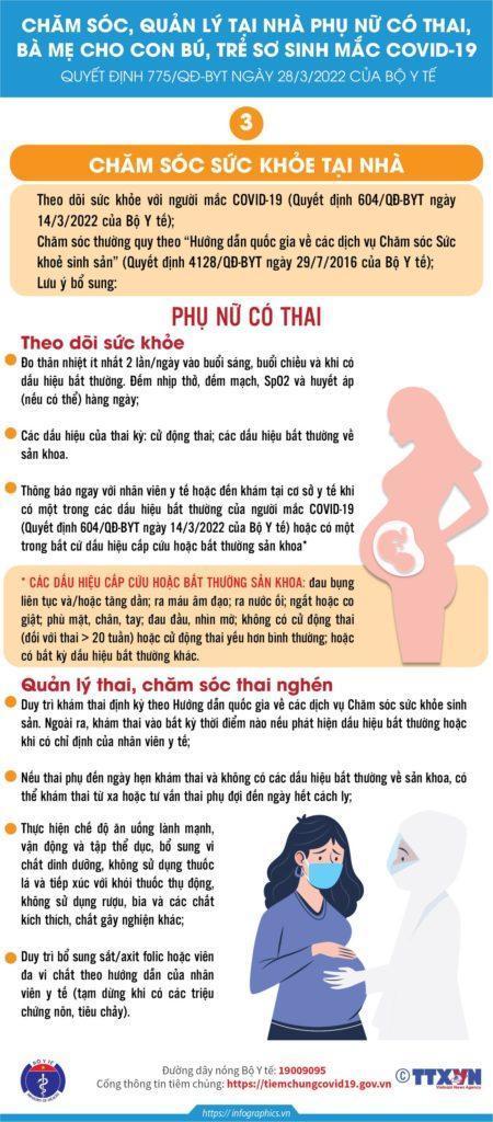 Ngày 28/3/2022 Bộ Y tế ban hành Quyết định 775/QĐ-BYT Hướng dẫn chăm sóc, quản lý tại nhà đối với phụ nữ có thai, bà mẹ cho con bú và trẻ sơ sinh mắc COVID-19. Dưới đây là nội dung hướng dẫn được trình bày trực quan lại dưới mô hình hóa cụ thể: