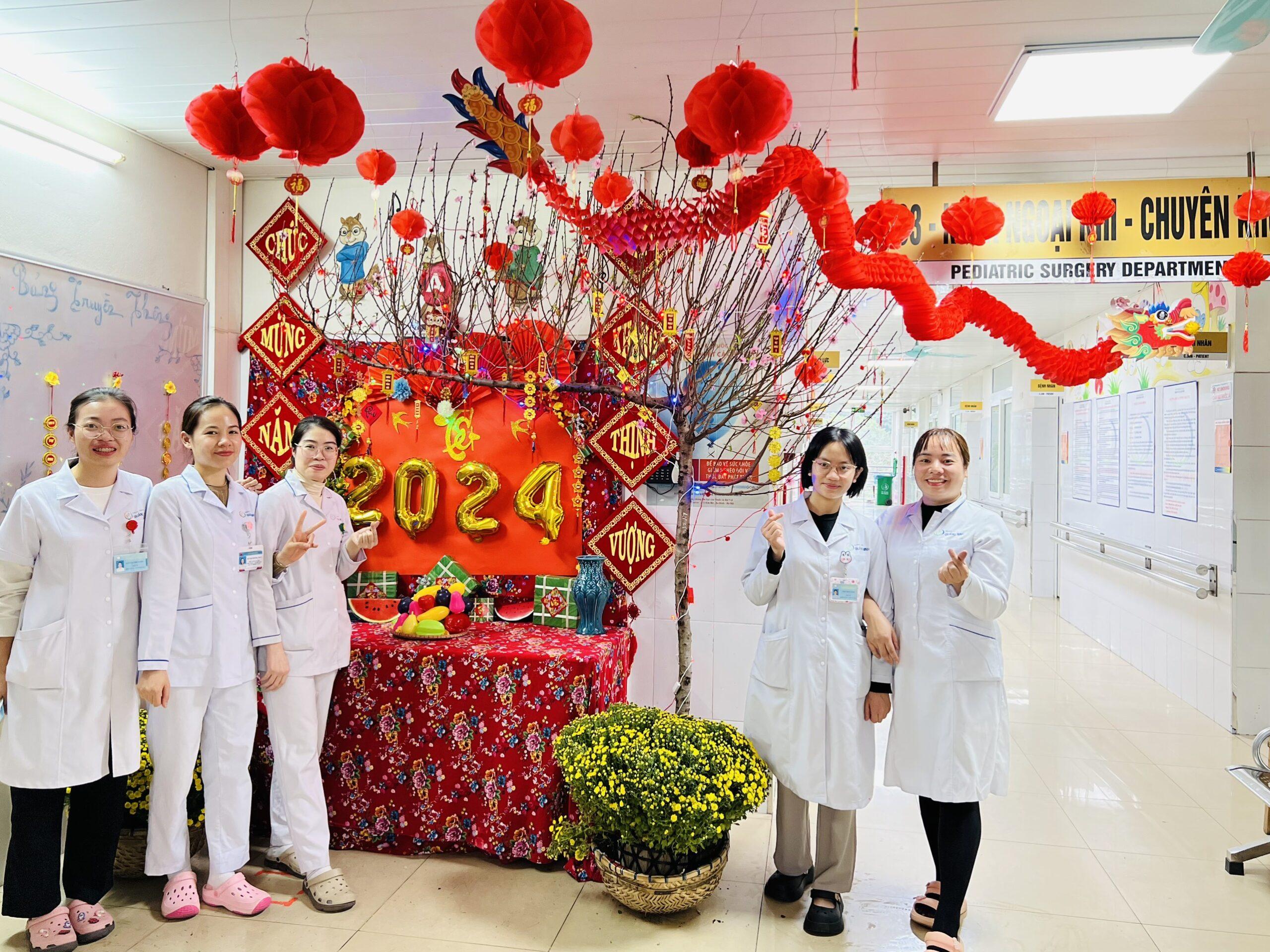 Bên cạnh đó, hòa chung không khí rộn ràng đón Tết Cổ Truyền dân tộc trên khắp mọi miền đất nước, với mong muốn mang đến sắc xuân, không gian ấm áp, để đón một năm mới thật nhiều sức khỏe, an khang, thịnh vượng và ngập tràn hạnh phúc tới những bệnh nhân, người nhà bệnh nhân cùng các cán bộ nhân viên y tế đang làm việc tại bệnh viện; Tại các khoa phòng, sảnh lớn và hội trường Bệnh viện Sản Nhi Quảng Ninh đã trang trí các khu tiểu cảnh, bàn trưng bày đón Tết với rực rỡ sắc đào mai nở, câu đối đỏ, bánh chưng xanh, biểu tượng linh vật… hòa quyện, đan xen cùng tiếng cười, lời chúc mang đến một không khí Tết đầy ấm áp, yêu thương, giúp người bệnh có thêm niềm vui, động lực vượt qua bệnh tật và phần nào vơi đi nỗi nhớ khi nhiều người bệnh và cán bộ y tế phải ăn Tết xa nhà, yên tâm công tác và thực hiện nhiệm vụ, giúp đảm bảo cho nhân dân trên địa bàn đón một cái Tết cổ truyền dân tộc đầy yên vui và hạnh phúc.