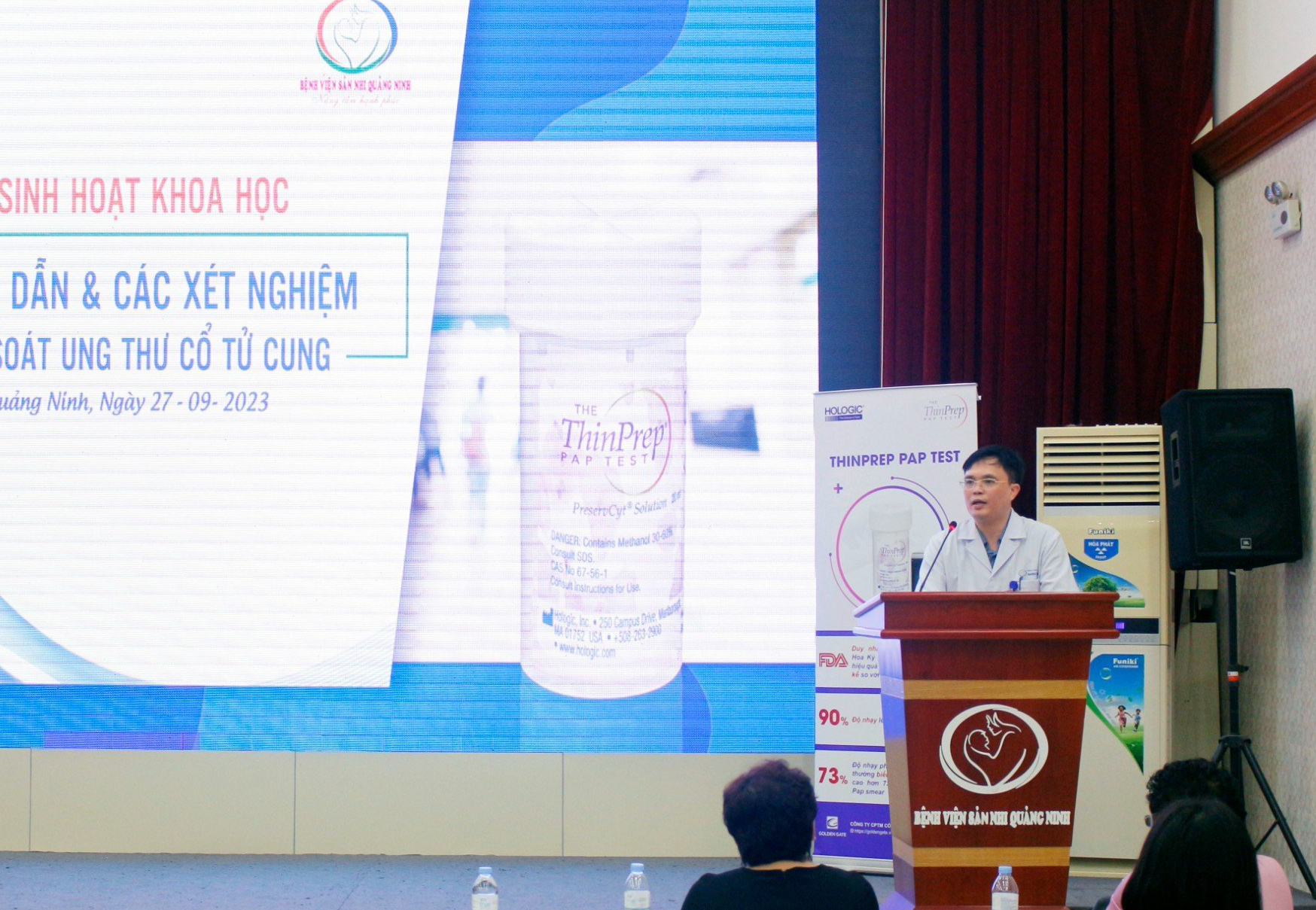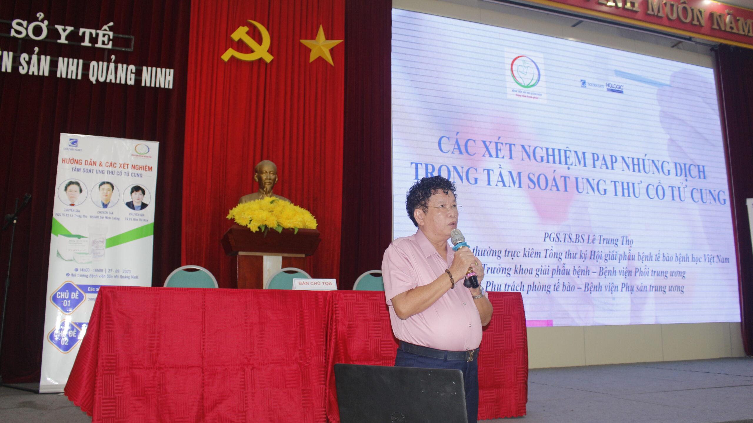 Nhằm kịp thời cập nhập và nâng cao kiến thức về ung thư CTC cũng như các hướng dẫn, xét nghiệm trong tầm soát ung thư CTC cho các cơ sở y tế trên địa bàn tỉnh; Ngày 27/9, tại Hội trường Bệnh viện Sản Nhi Quảng Ninh đã tổ chức buổi sinh hoạt khoa học “Hướng dẫn & các xét nghiệm tầm soát ung thư cổ tử cung”; Đến dự và chủ tọa có BSCKII. Bùi Minh Cường- Giám đốc BV Sản Nhi QN;  PGS.TS BS Lê Trung Thọ – Phó Chủ tịch thường trực kiêm Tổng thư ký Hội giải phẫu bệnh tế bào bệnh học Việt Nam, Trưởng khoa giải phẫu bệnh – Bệnh viện Phổi trung ương, Phụ trách phòng tế bào – Bệnh viện Phụ sản trung ương; TS.BS Đào Thị Hoa – Trưởng khoa khám bệnh – Bệnh viện Phụ sản Trung ương, cùng các đồng chí trong  Ban Lãnh đạo bệnh viện, các đồng chí trưởng khoa phòng và hơn 100 học viên là các bác sĩ, kỹ thuật viên xét nghiệm, cán bộ y tế trong bệnh viện cũng như tại các điểm cầu đơn vị y tế trong tỉnh tham dự