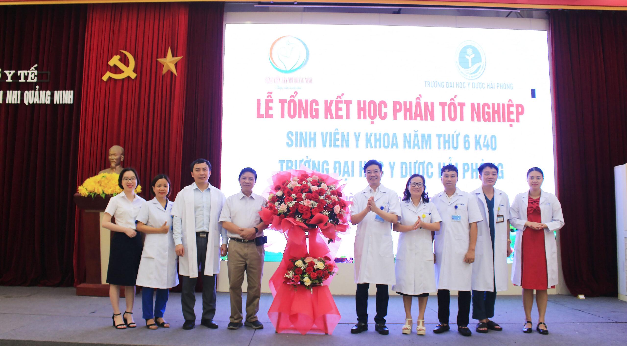 Tại buổi Lễ, đại diện nhà trường và sinh viên trường Đại học Y dược Hải Phòng đã gửi lời chúc cùng những lẵng hoa tươi thắm và lời cảm ơn đến toàn thể Lãnh đạo, cán bộ y tế Bệnh viện Sản Nhi Quảng Ninh đã tạo điều kiện tốt nhất về cơ sở vật chất, trang thiết bị và môi trường thực hành khang trang, hiện đại, với đội ngũ giảng viên giàu kinh nghiệm đã luôn nhiệt tình hướng dẫn, không chỉ giúp các sinh viên củng cố kiến thức chuyên môn được học mà còn trang bị thêm nhiều kinh nghiệm thực tế, có cơ hội trau dồi y đức, rèn luyện kỹ năng giao tiếp ứng xử với người bệnh, đồng nghiệp, tạo tiền đề cho các em có thể tự tin, vững vàng thực hành nghề sau khi tốt nghiệp, trở thành những bác sĩ giỏi của đất nước, góp phần vào sự nghiệp chăm sóc sức khỏe nhân dân.
