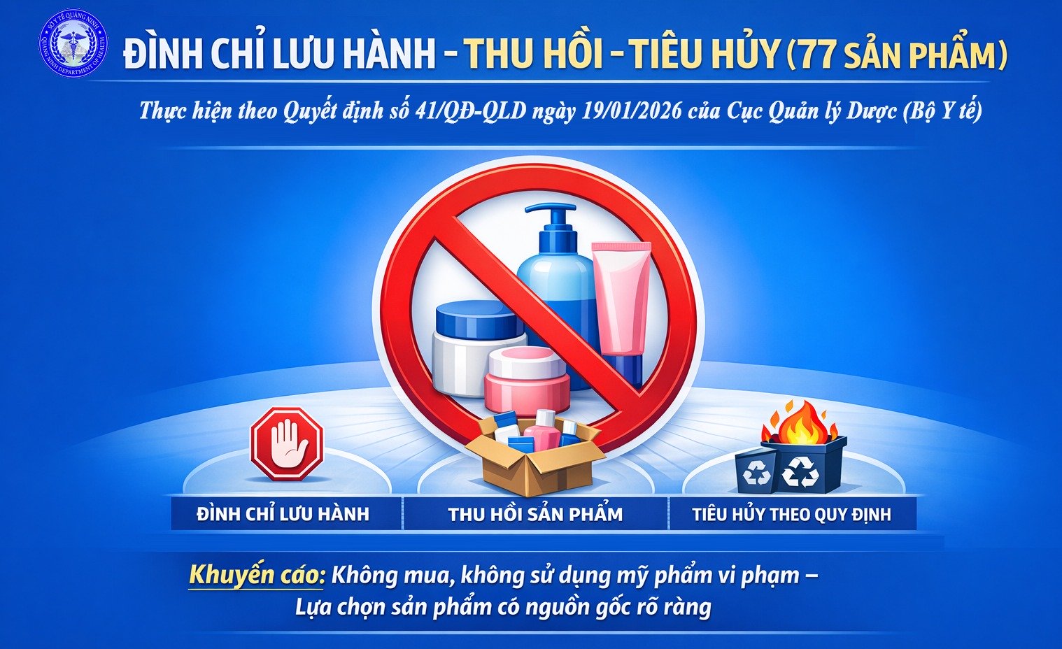 Nhằm bảo đảm an toàn cho người tiêu dùng và tăng cường công tác quản lý nhà nước trong lĩnh vực mỹ phẩm, Sở Y tế Quảng Ninh vừa ban hành văn bản số 463/SYT – NVD ngày 20/1/2026 về việc đình chỉ lưu hành, thu hồi và tiêu hủy 77 sản phẩm mỹ phẩm vi phạm trên địa bàn tỉnh.