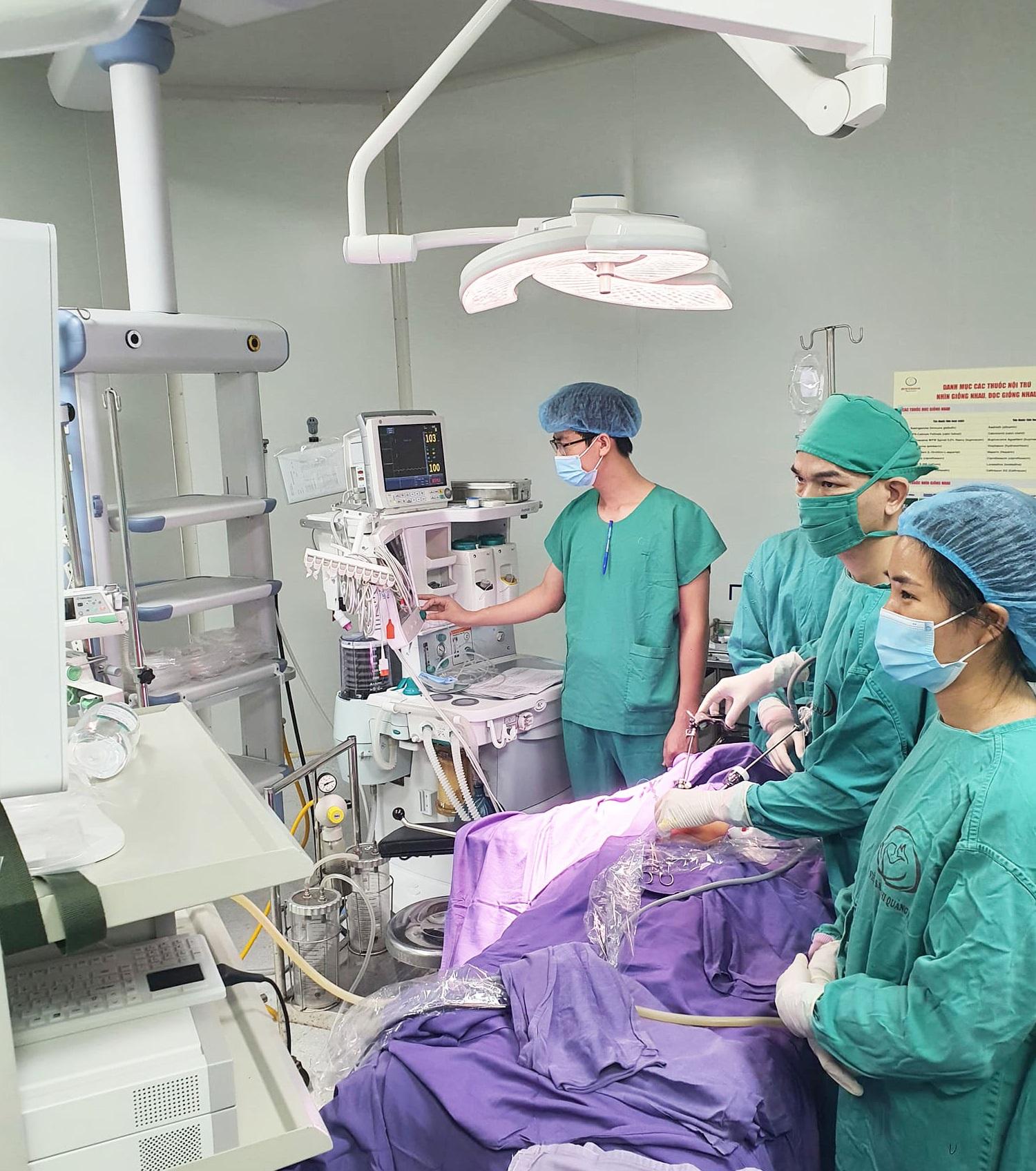 Qua khai thác và thăm khám lâm sàng, các bác sĩ chẩn đoán trẻ bị thoát vị bẹn nghẹt bên phải. Ngay lập tức kíp cấp cứu khẩn trương chuyển bé lên phòng mổ nội soi cấp cứu, kịp thời đưa khối thoát vị là một đoạn ruột non dài 08cm ra khỏi ống bẹn, sau 5 phút đoạn ruột đã được cung cấp máu và hồng trở lại, tránh được tình trạng dẫn đến hoại tử ruột. Sau mổ, sức khỏe trẻ dần ổn định và đã được ra viện.
