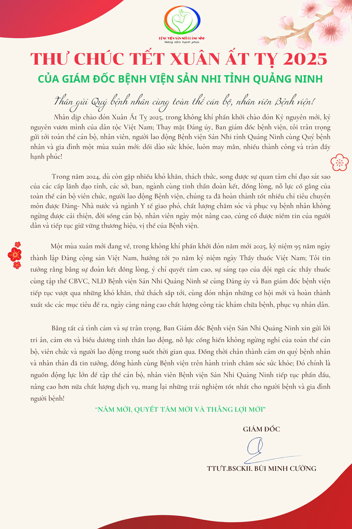 Nhân dịp chào đón Xuân Ất Tỵ 2025, trong không khí phấn khởi chào đón Kỷ nguyên mới, kỷ nguyên vươn mình của dân tộc Việt Nam; Thay mặt Đảng ủy, Ban giám đốc bệnh viện, tôi trân trọng gửi tới toàn thể cán bộ, nhân viên, người lao động Bệnh viện Sản Nhi tỉnh Quảng Ninh cùng Quý bệnh nhân và gia đình một mùa xuân mới: dồi dào sức khỏe, luôn may mắn, nhiều thành công và tràn đầy hạnh phúc!