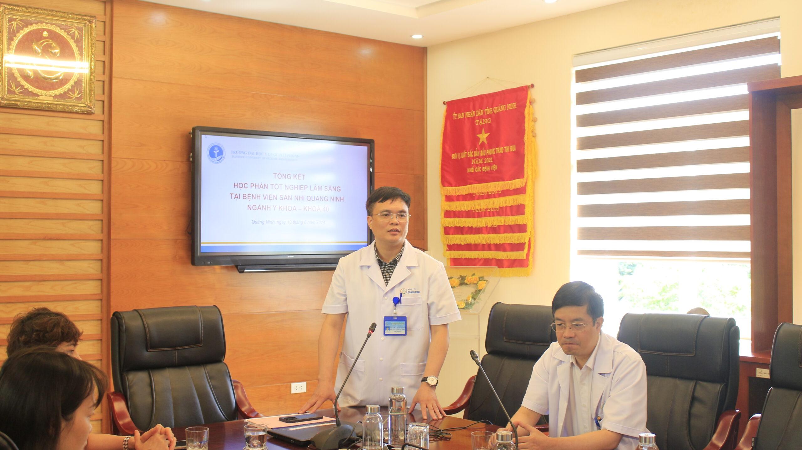 Sáng ngày 13/6, tại Hội trường Bệnh viện Sản Nhi tỉnh Quảng Ninh, Trường Đại học Y Dược Hải Phòng và Bệnh viện Sản Nhi Quảng Ninh đã tổ chức Chương trình tổng kết học phần tốt nghiệp lâm sàng ngành y khoa khóa 40 và thống nhất phương hướng, kế hoạch đào tạo trong các năm tiếp theo; Tham dự có PGS.TS Đinh Thị Thanh Mai – Phó Hiệu trưởng trường ĐH Y Dược Hải Phòng cùng các đồng chí cán bộ giảng viên tại trường; về phía bệnh viện có BSCKII. Bùi Minh Cường- Giám đốc BV cùng các đồng chí trong Ban giám đốc, trưởng, phó/phụ trách khoa phòng đồng thời là các giảng viên kiêm chức tại bệnh viện.